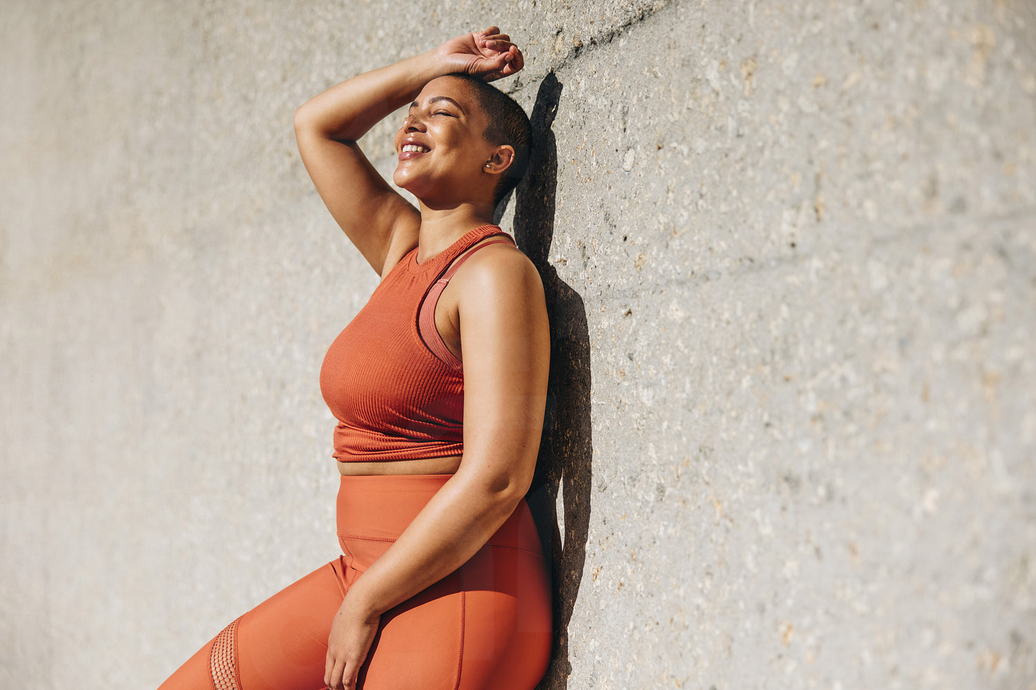 Woman with plus size body leaning to a wall and relaxing after workout session outdoors. Woman in sports clothing taking a break from exercise.