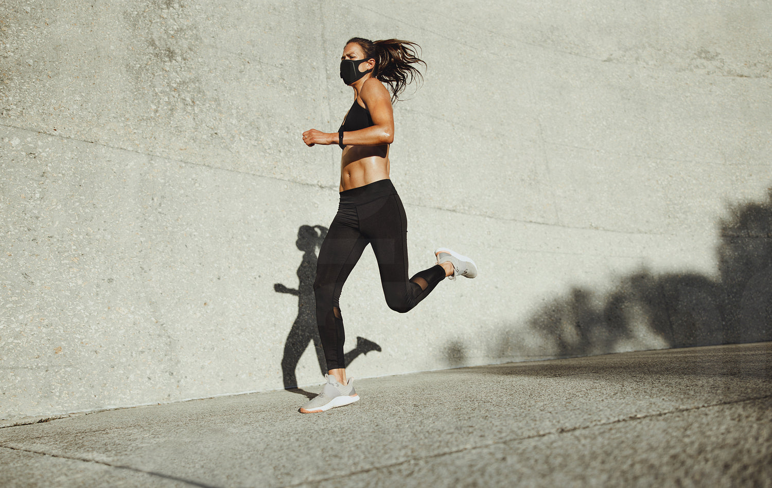 Sportswoman wearing protective face mask on morning run. Female in sports wear sprinting outdoors.