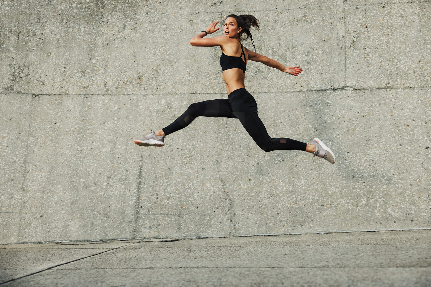 Sporty woman doing running and jumping exercise outdoors. Fitness female athlete exercising outdoors.