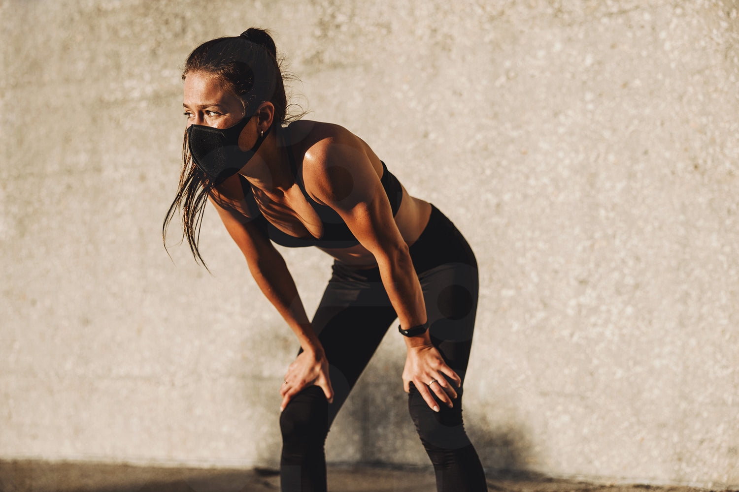 Fitness woman wearing protective face mask taking a break after a run. Female in sportswear resting after intense workout outdoors.