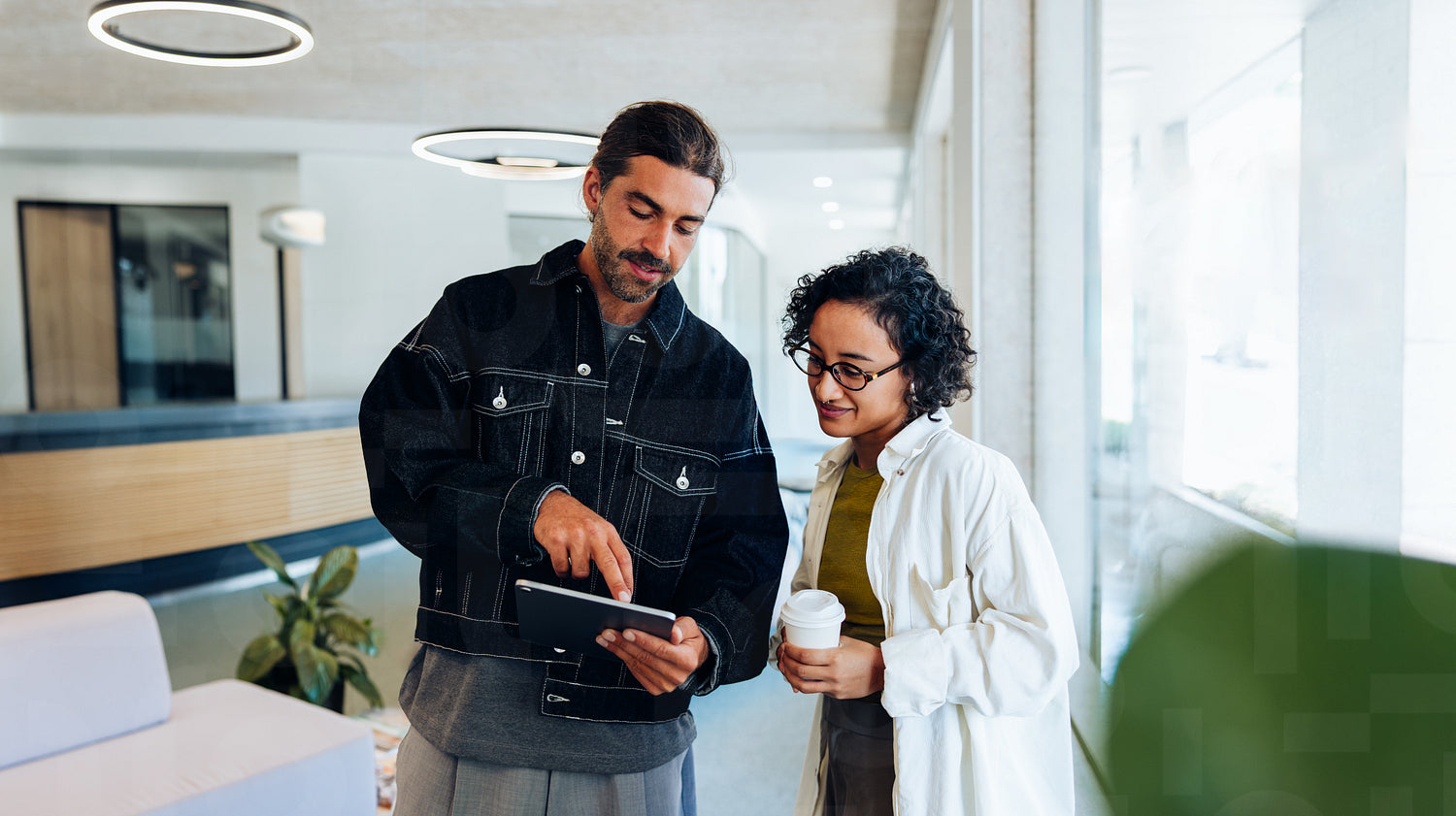 A man and a woman review a tablet in a sleek office lobby, sharing ideas as they discuss strategies and projects.