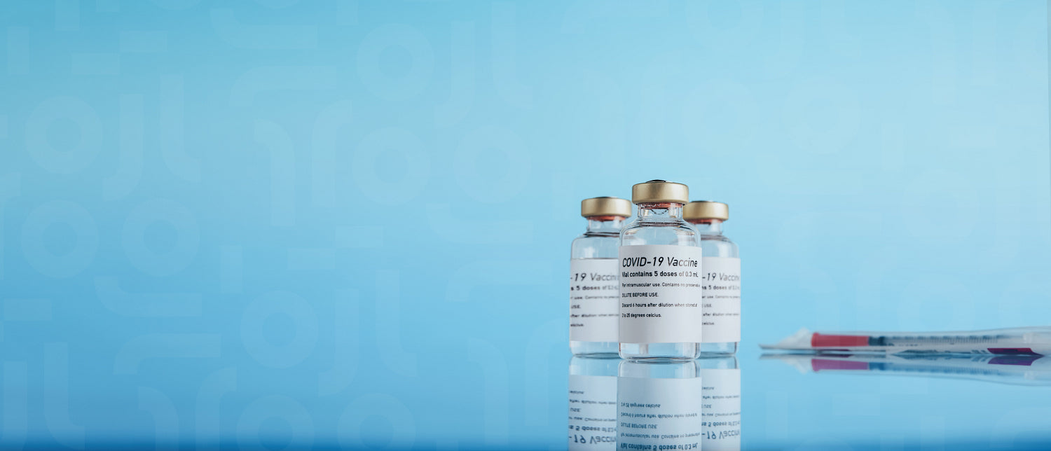 Vials of corona virus vaccine and syringe over reflective surface. Covid-19 vaccine bottles with an injection on blue background.