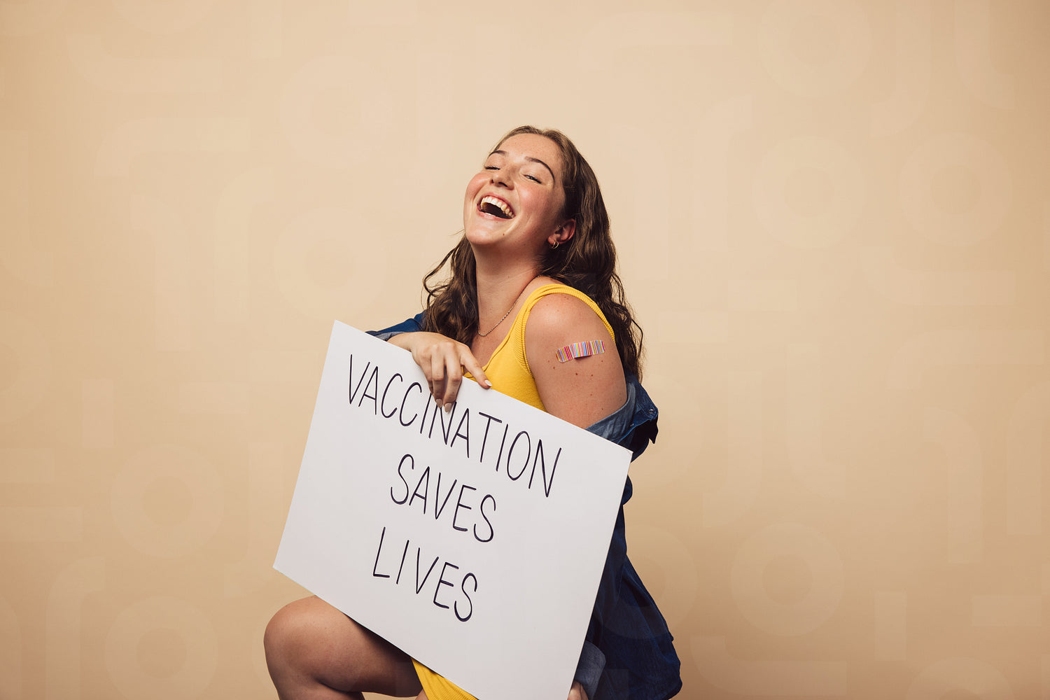 Laughing woman with a banner showing "vaccination saves lives". Female after getting vaccination holding a banner on brown background.