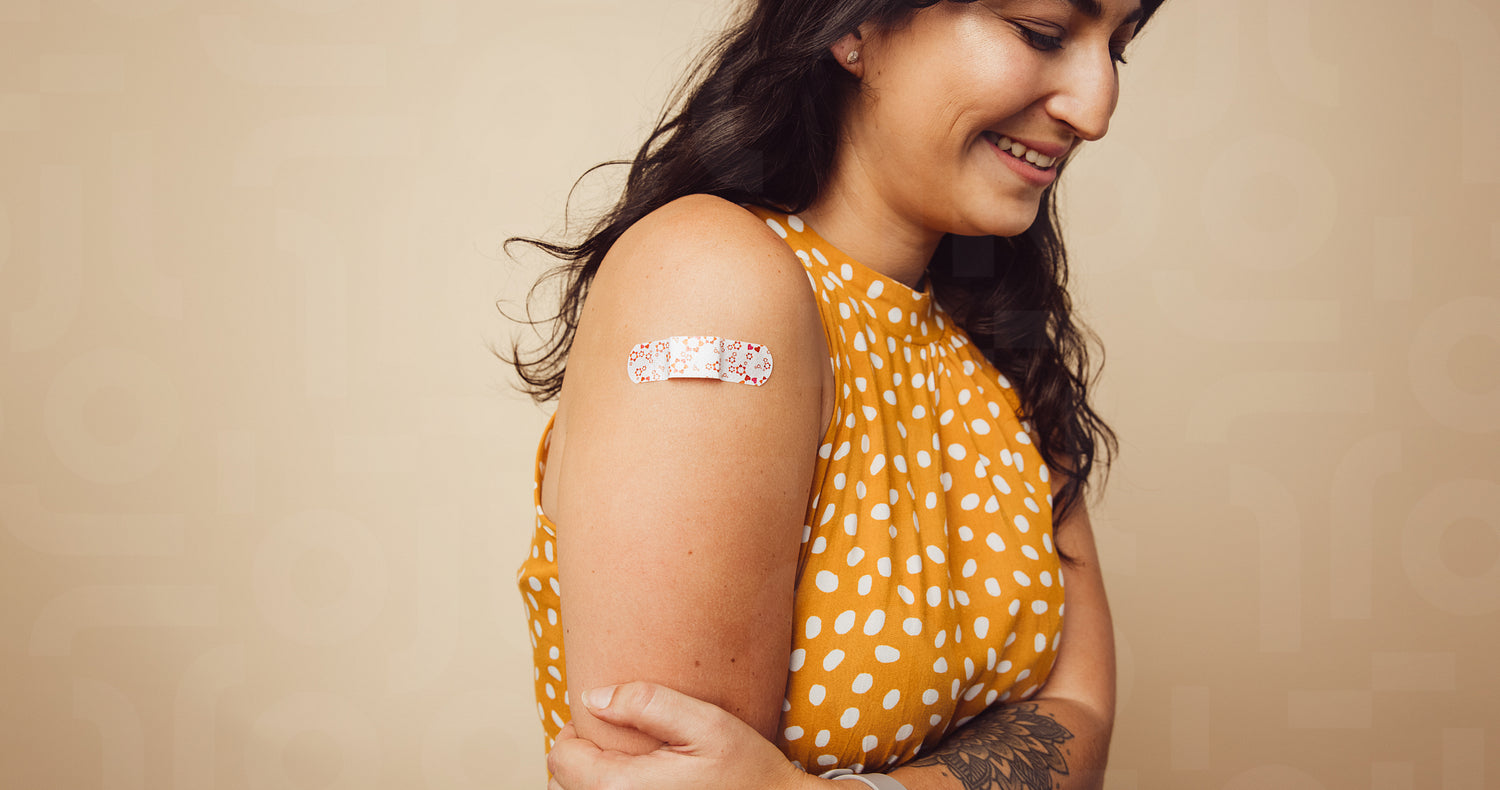 Bandage on arm of a mature woman after getting vaccine dose. Female received vaccination on her arm.