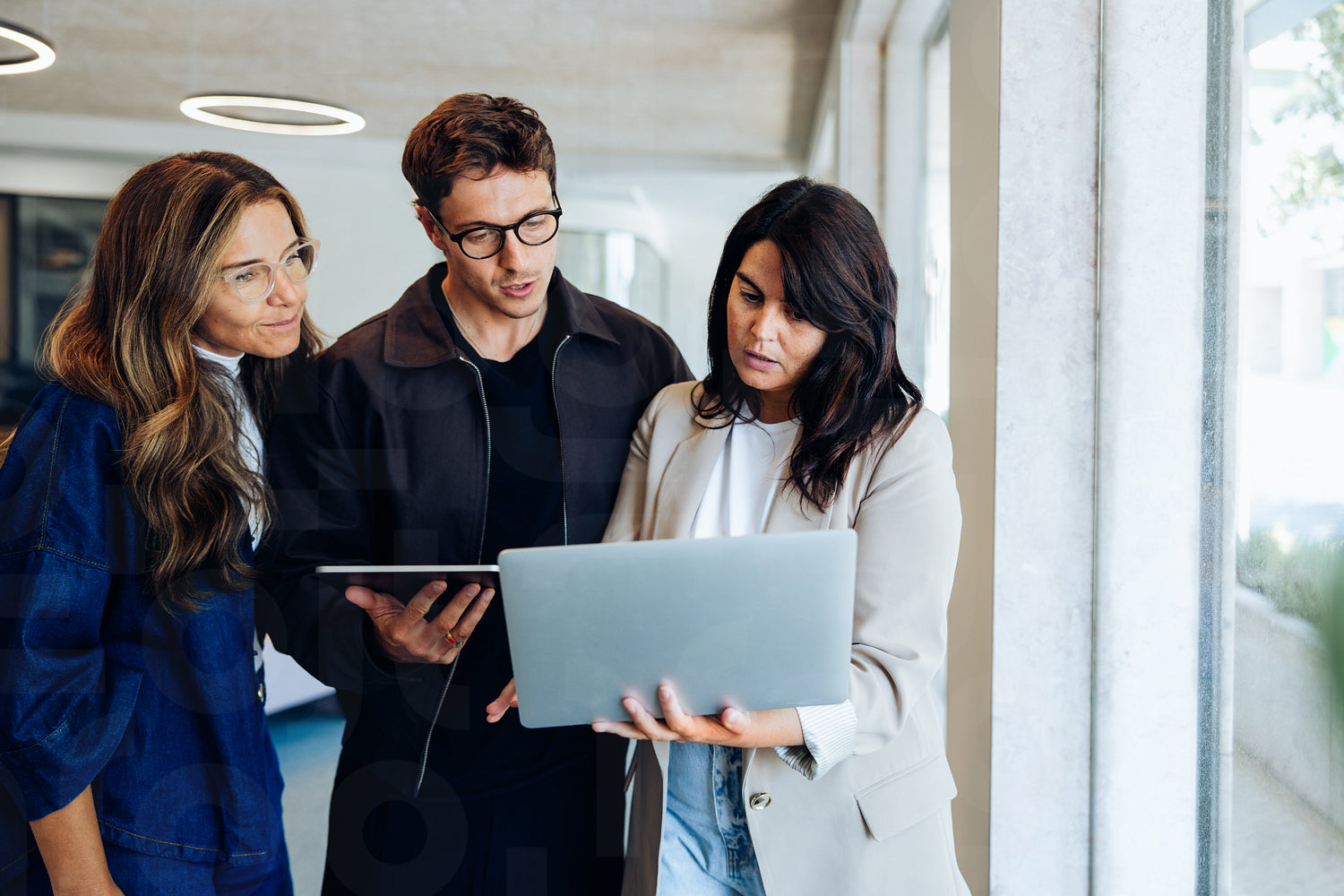 Three coworkers, two women and one man, review a laptop and tablet in a well lit office as they discuss ideas and strategies.