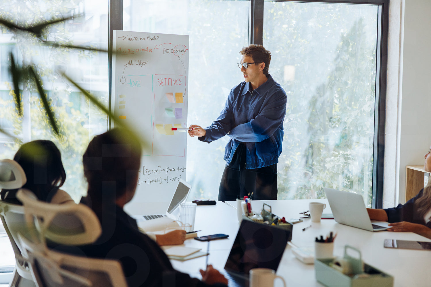 A male UX designer explains a whiteboard plan to a mixed team in a conference room, outlining user flows and home page elements as colleagues take notes and discuss.