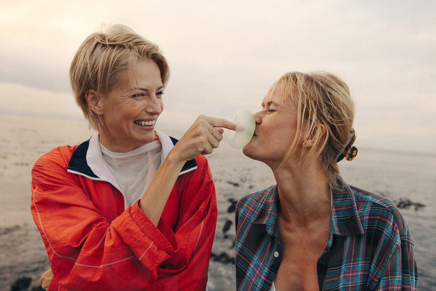 Seaside fun: Woman playfully pops her friend's bubble gum