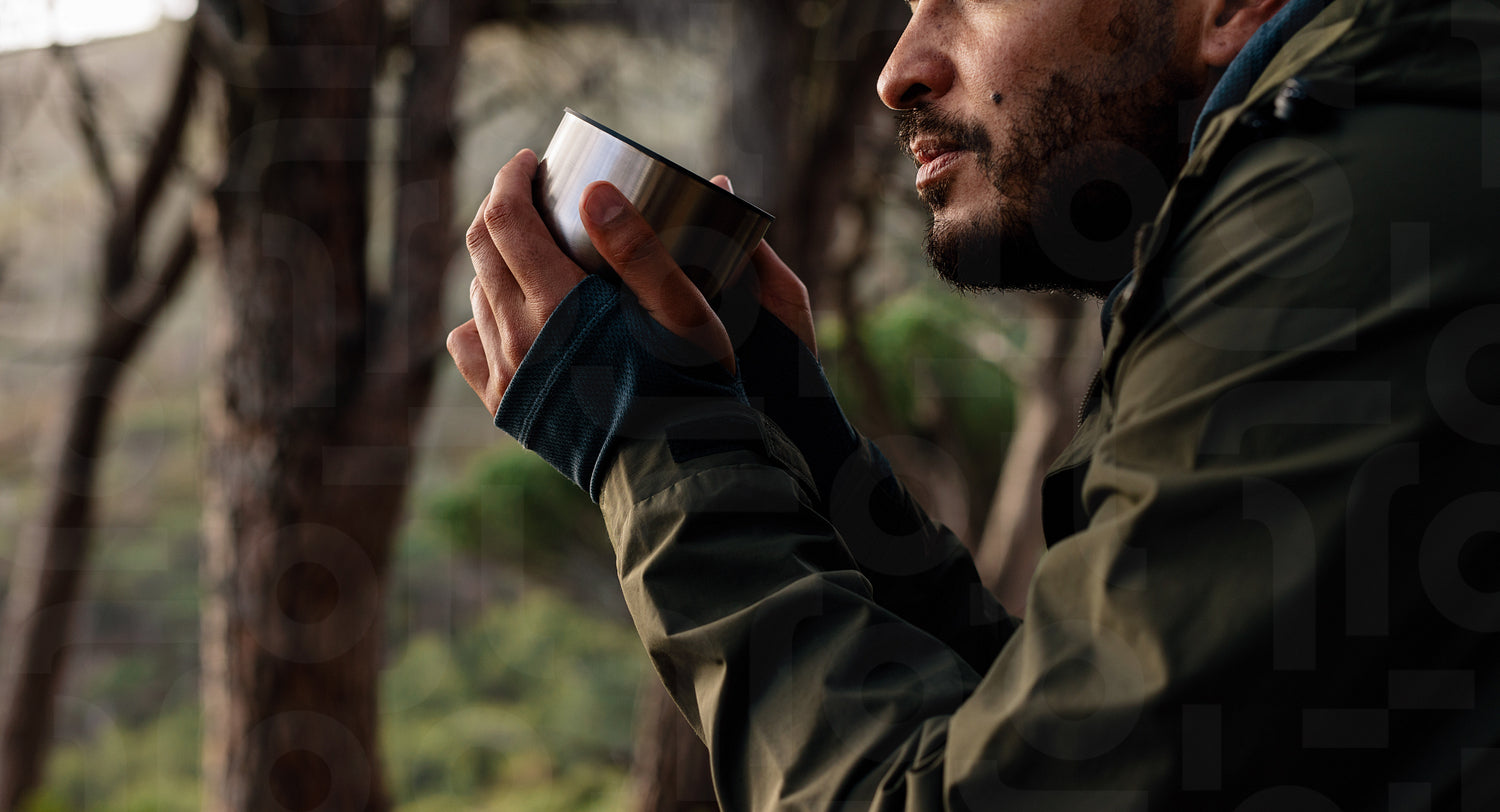 Close up shot of young male hiker drinking coffee. Cropped image of male hiker taking rest during hike.