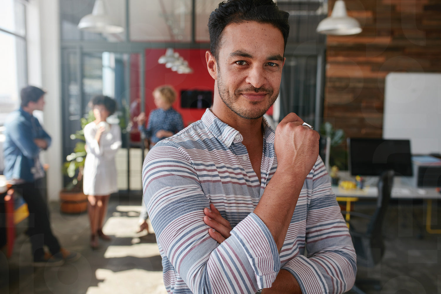 Portrait of confident young man standing in his office. Caucasian man at his work place with colleagues talking in background.