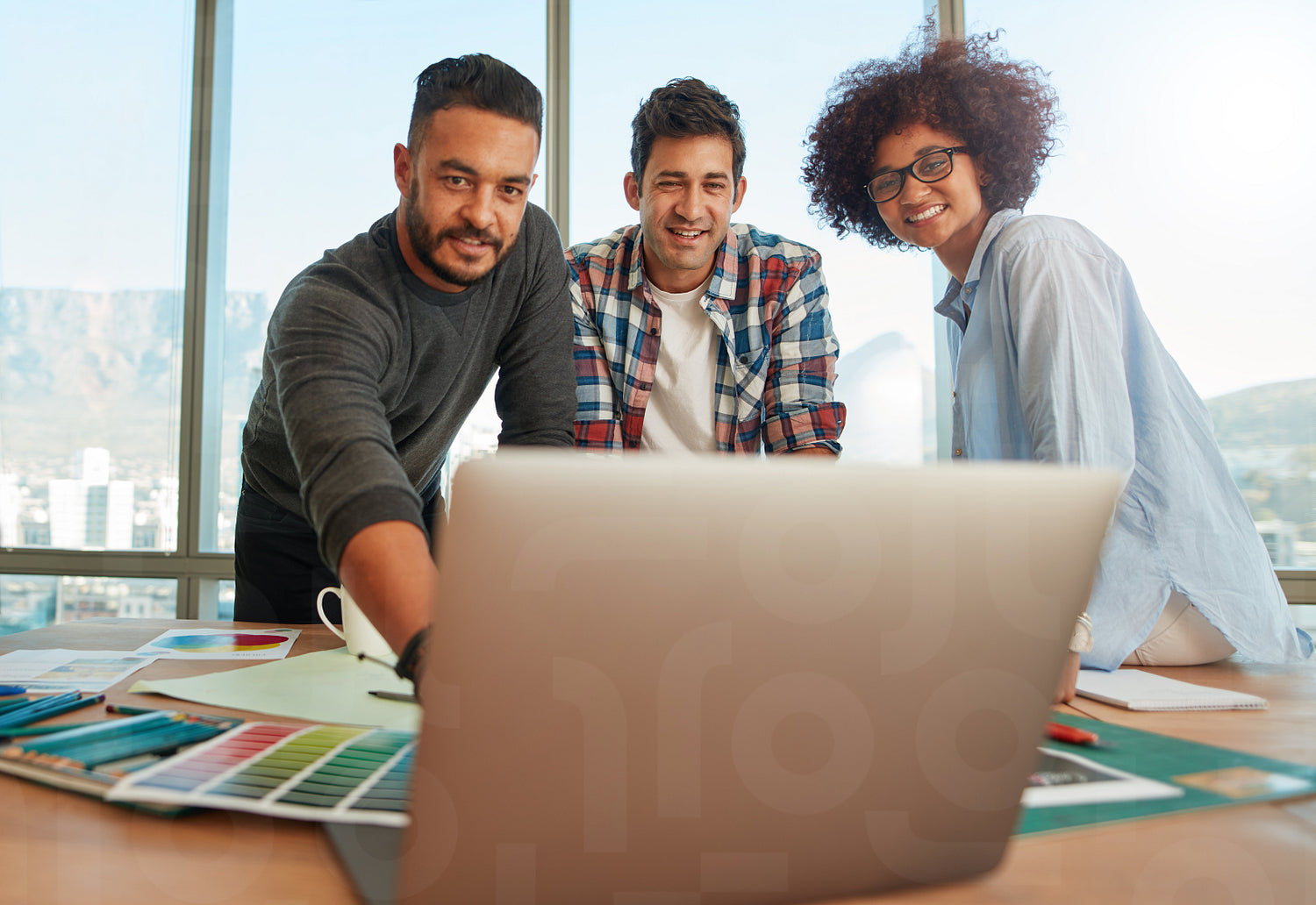 Indoor shot of creative start-up team discussing ideas in business meeting. Multi ethnic business people working together on new project in office.