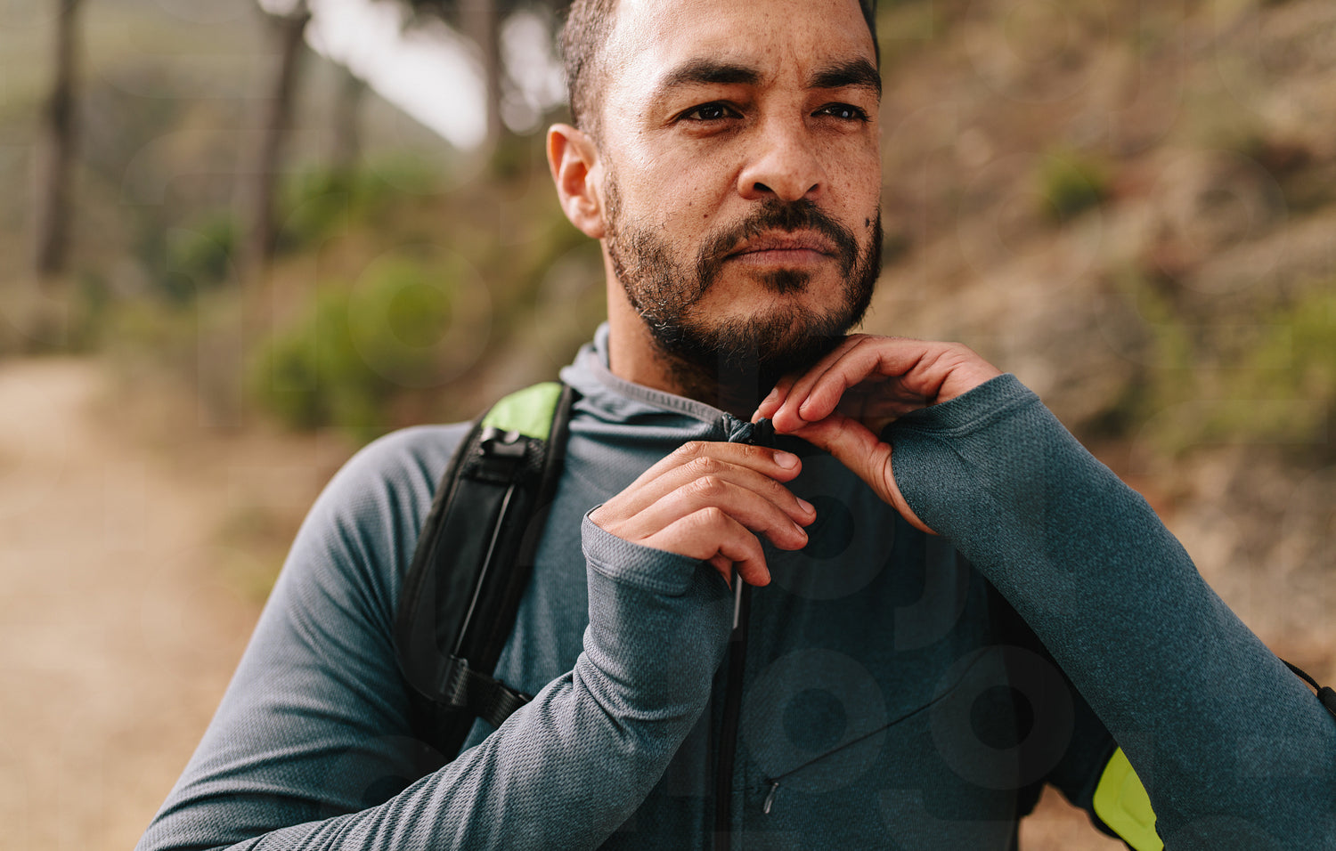 Portrait of fit young guy outdoors on mountain trail. Healthy young male runner adjusting his jacket zip on country road.