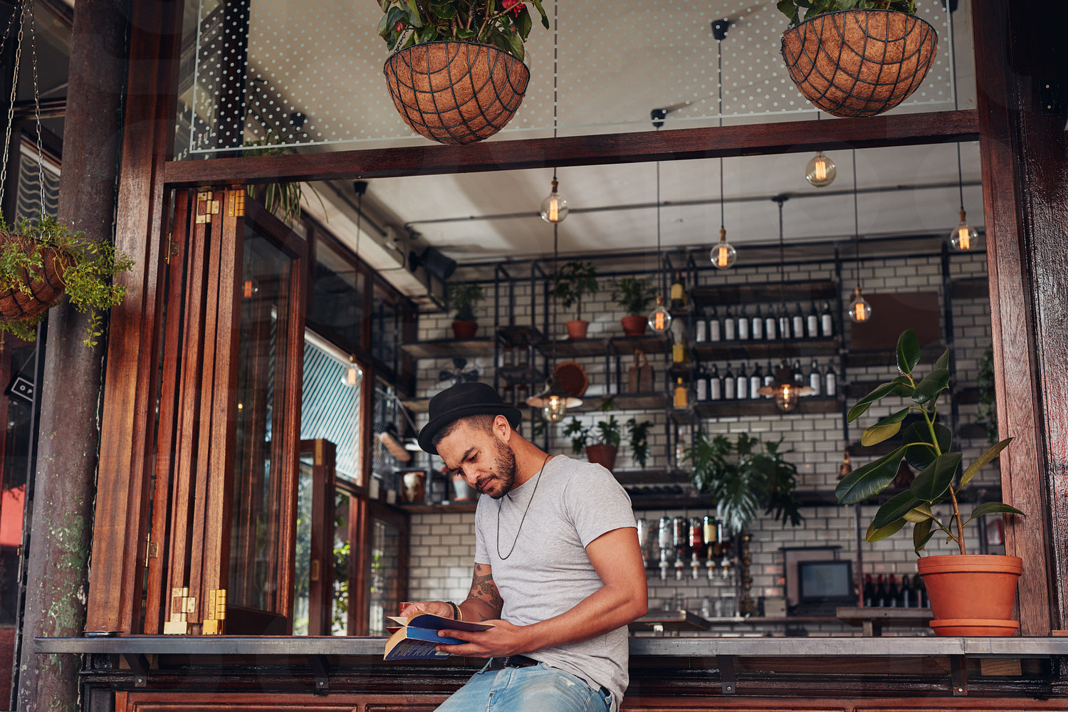 Portrait of relaxed young man sitting at a cafe counter reading a book. Stylish young guy reading novel while sitting at a restaurant counter.
