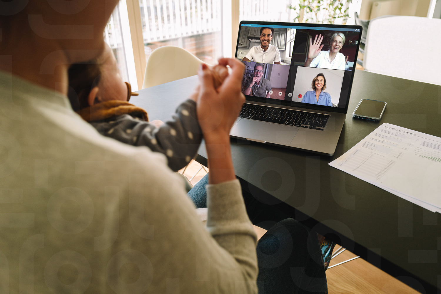 Group of business people smart working from home. Woman at home talking to her colleagues over a video conference.