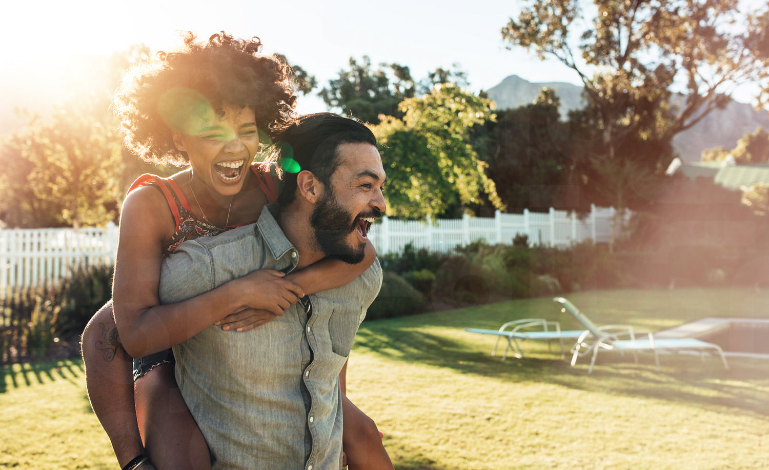 Outdoor shot of young couple piggybacking in backyard. Smiling man carrying his girlfriend on his back.