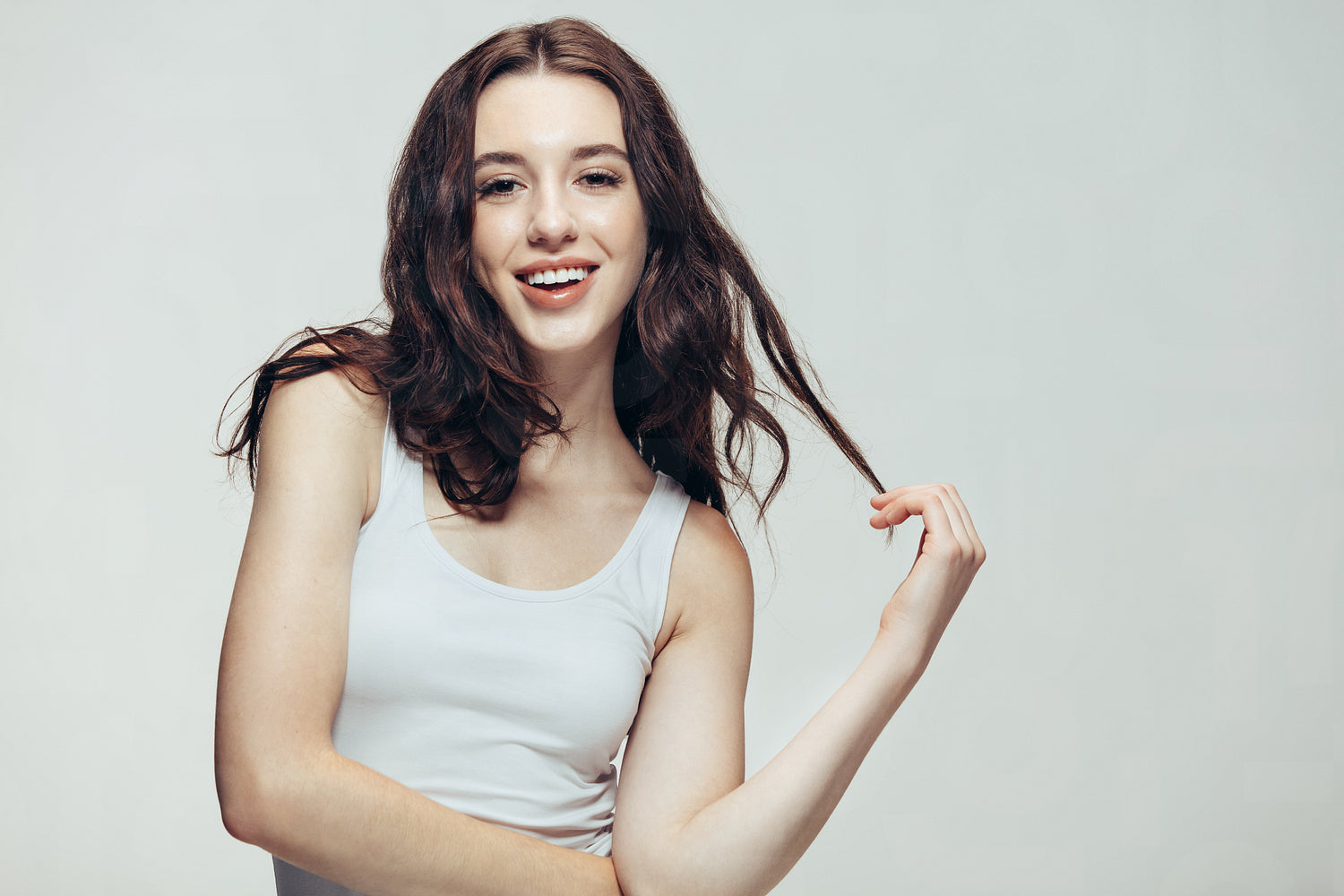 Portrait of attractive young woman in casuals standing against grey background. Caucasian female model looking at camera and smiling.
