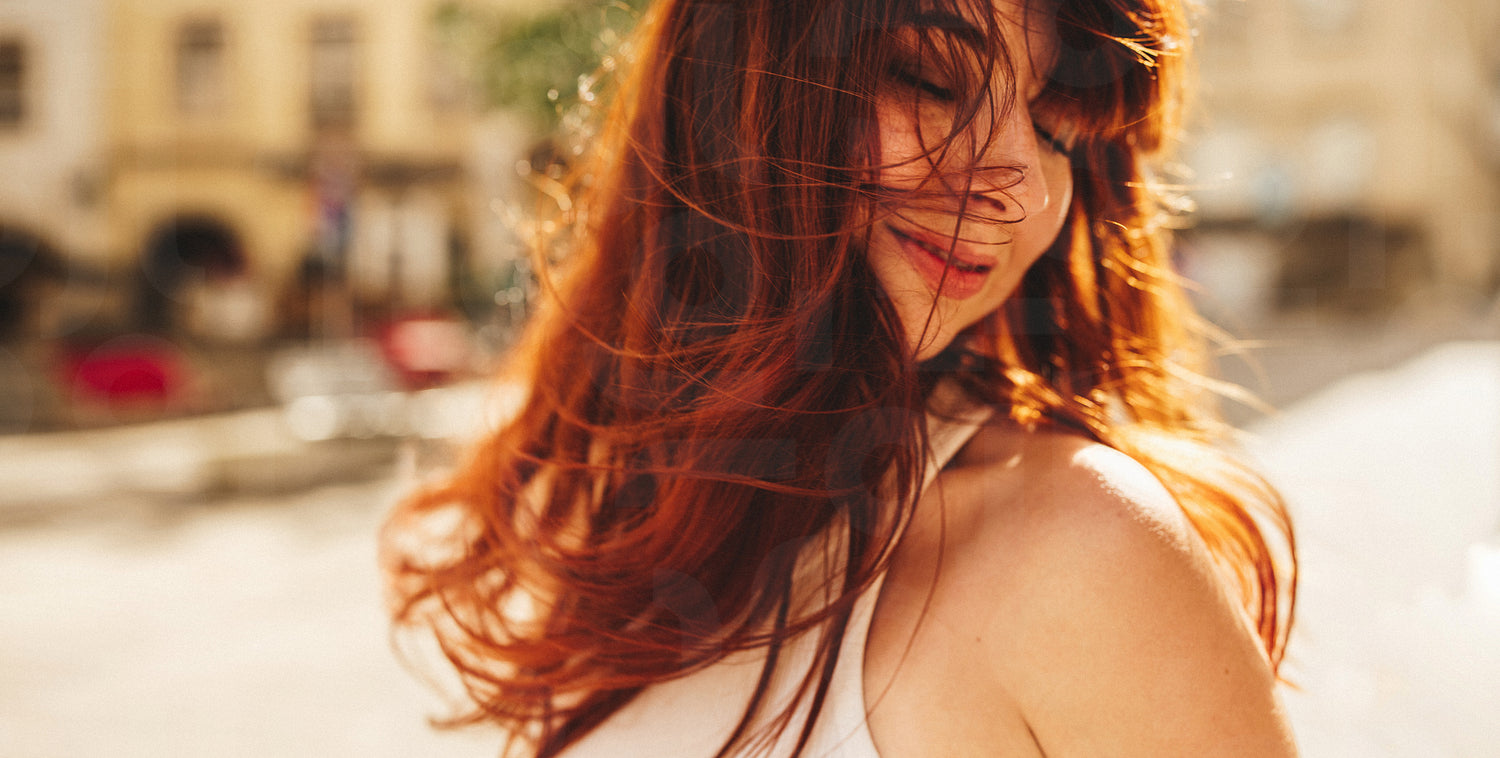 Red-haired woman having fun in the city during summer. Woman with ginger hair stands in the street during the day. This photo has intentional use of 35mm film grain.