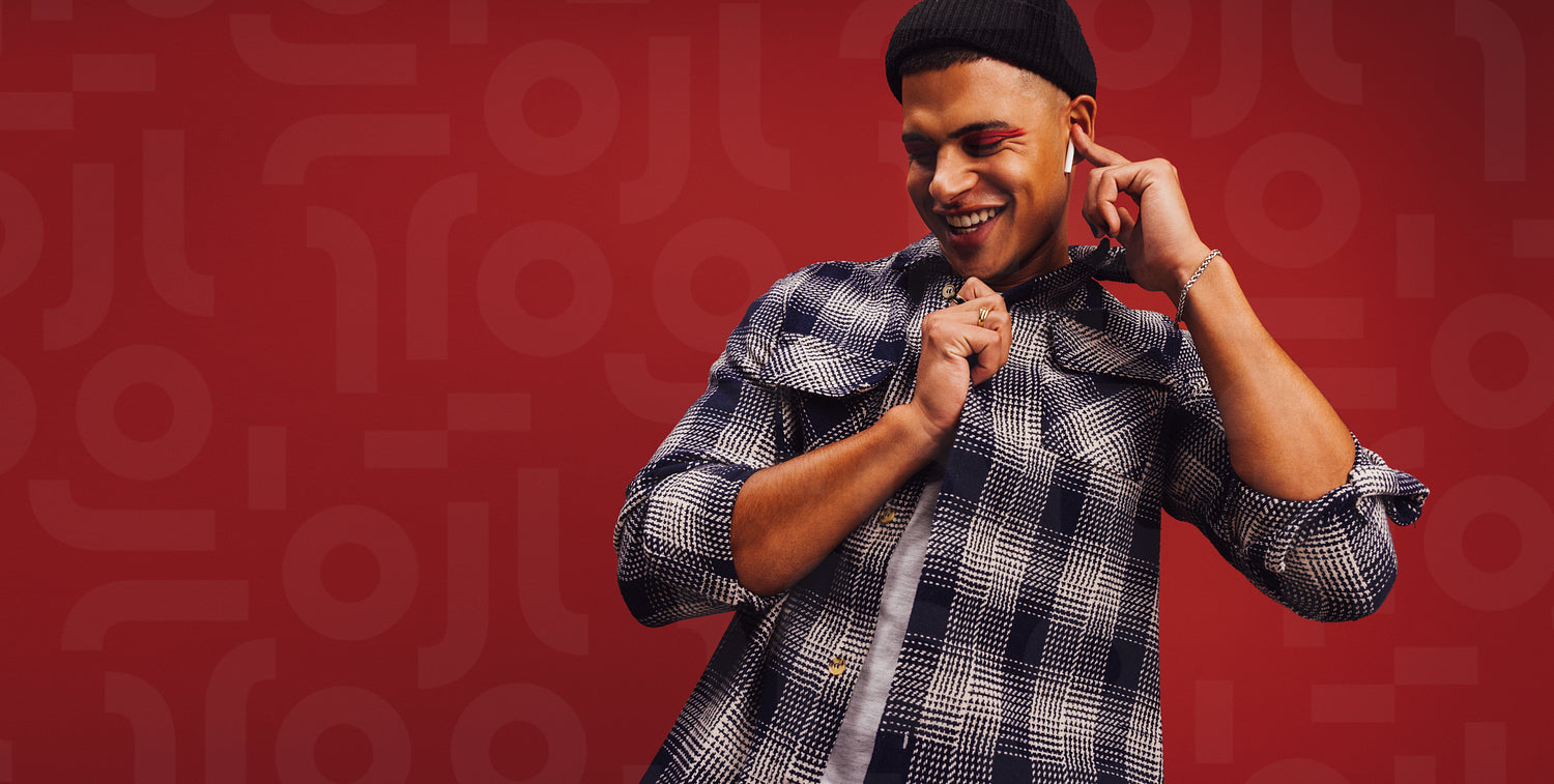 Listening to happy tunes. Happy young man enjoying his favourite playlist on his wireless earphones. Handsome young man dancing to music while standing against a red background.