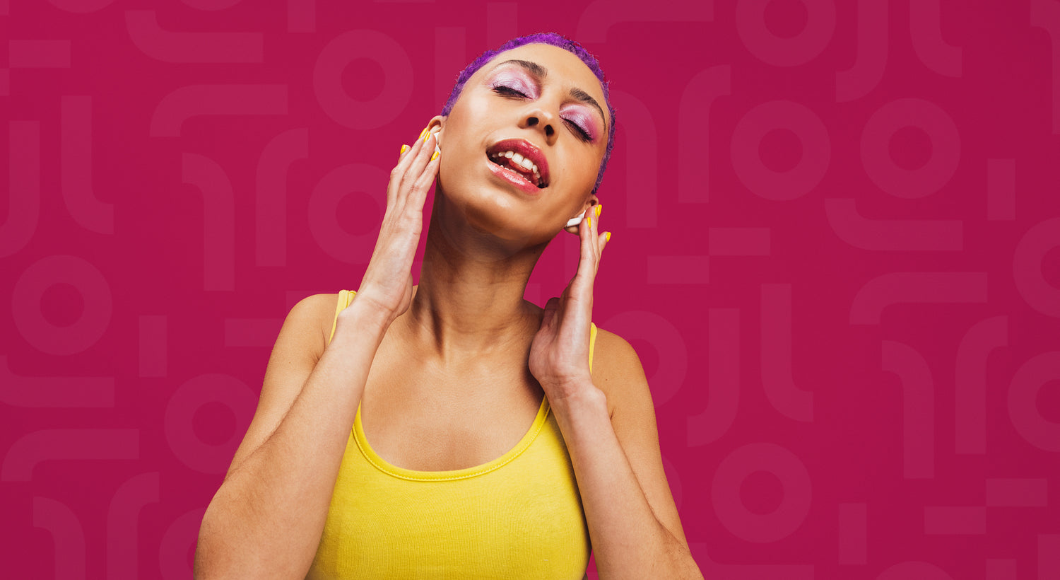 Listening to soothing music. Happy young woman touching her wireless earphones while listening to her favourite song. Woman with purple hair standing with her eyes closed against a pink background,