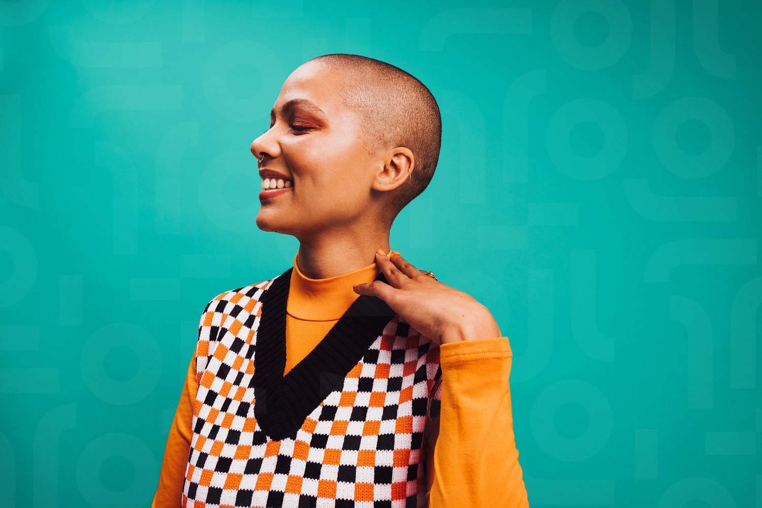 Self-confident woman with short hair smiling in a studio. Happy young woman standing with her eyes closed against a turquoise background. Fashionable young woman wearing a septum ring.