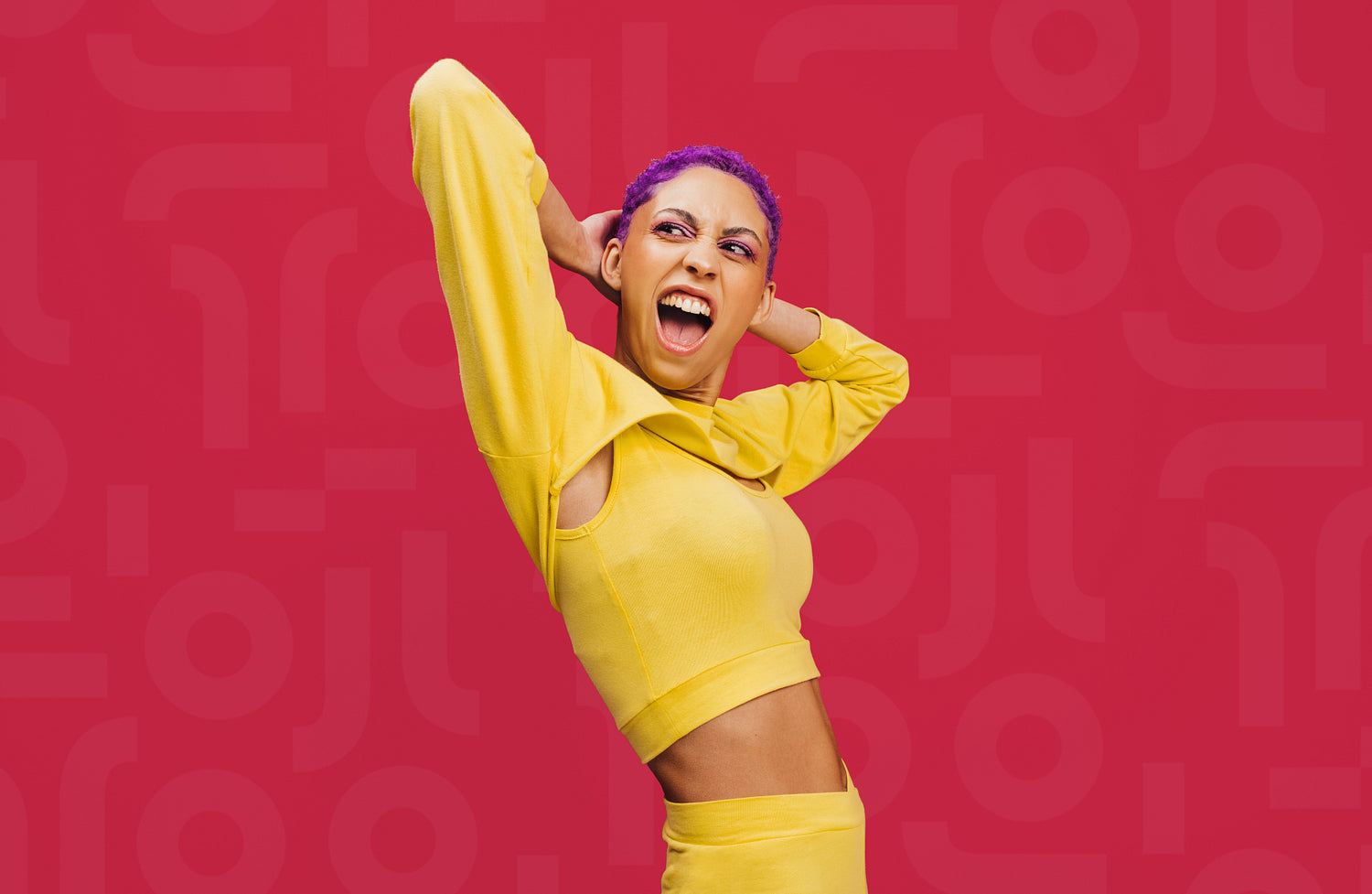 Stylish young woman standing with her hands behind her head in a studio. Fashionable young woman wearing makeup up with purple hair. Young woman being quirky against a pink background.