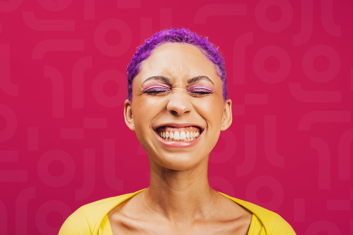 Vibrant vibes. Excited young woman smiling with her eyes closed while standing against a pink background. Fashionable young woman wearing makeup with purple hair in a studio.