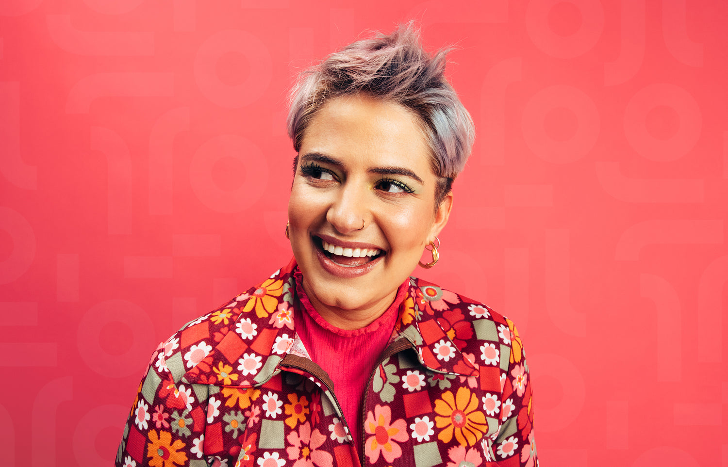 Carefree young woman looking away with a smile on her face. Happy young woman standing alone against a red background. Fashionable young woman with dyed hair feeling vibrant.