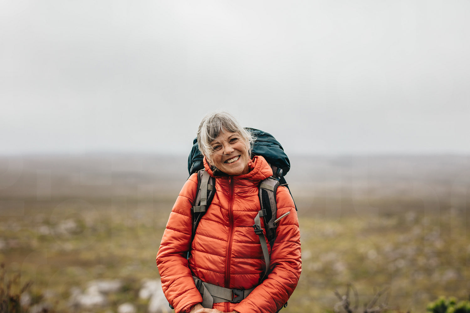 Close up of a senior woman standing on a hill wearing jacket and backpack. Smiling senior woman on a hiking trip on a hill.