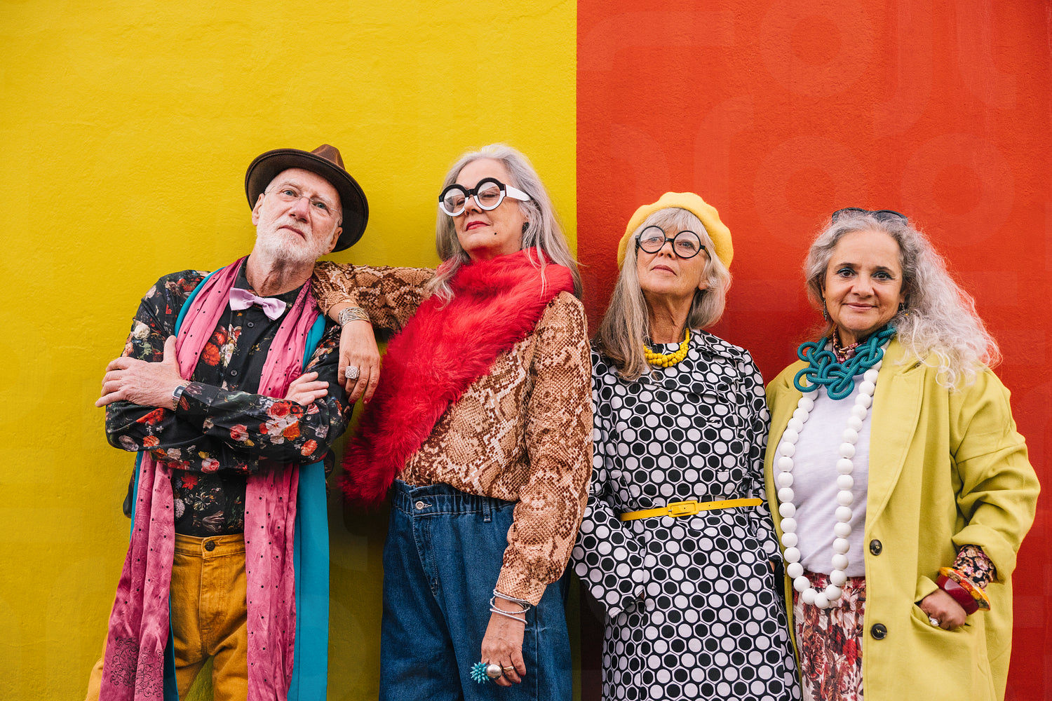 Vibrant elderly people looking at the camera while standing together against a colourful wall. Group of four senior citizens feeling confident and youthful in colourful clothing.