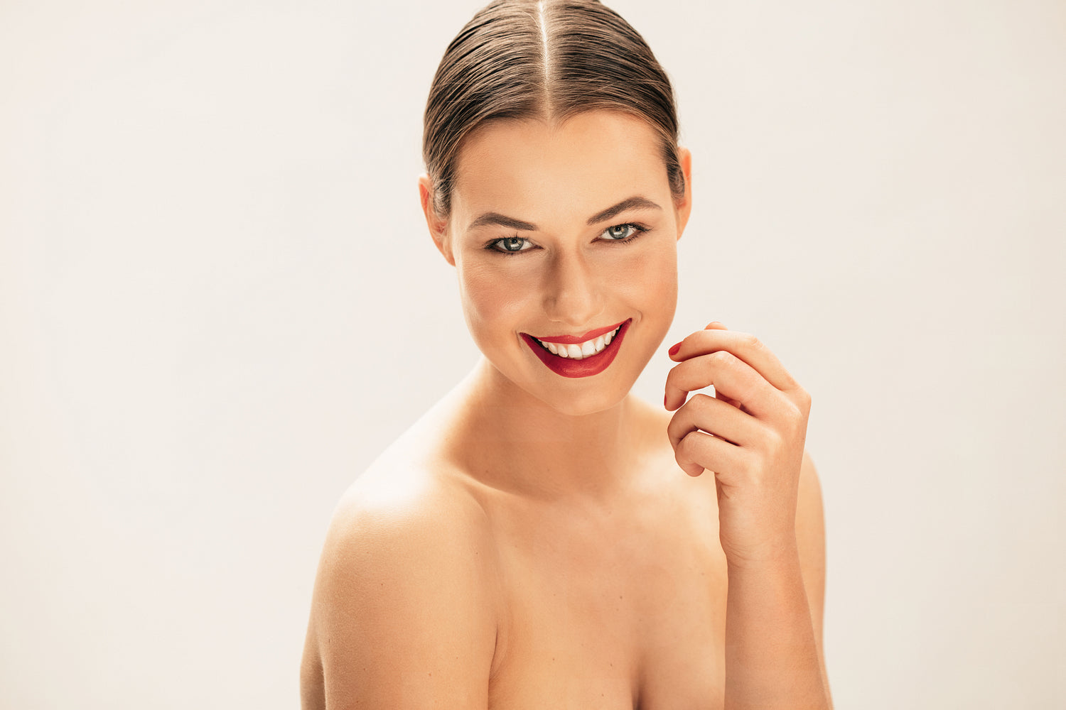 Portrait of beautiful young topless woman smiling in studio. Caucasian female model posing with pretty smile on her face against beige background.