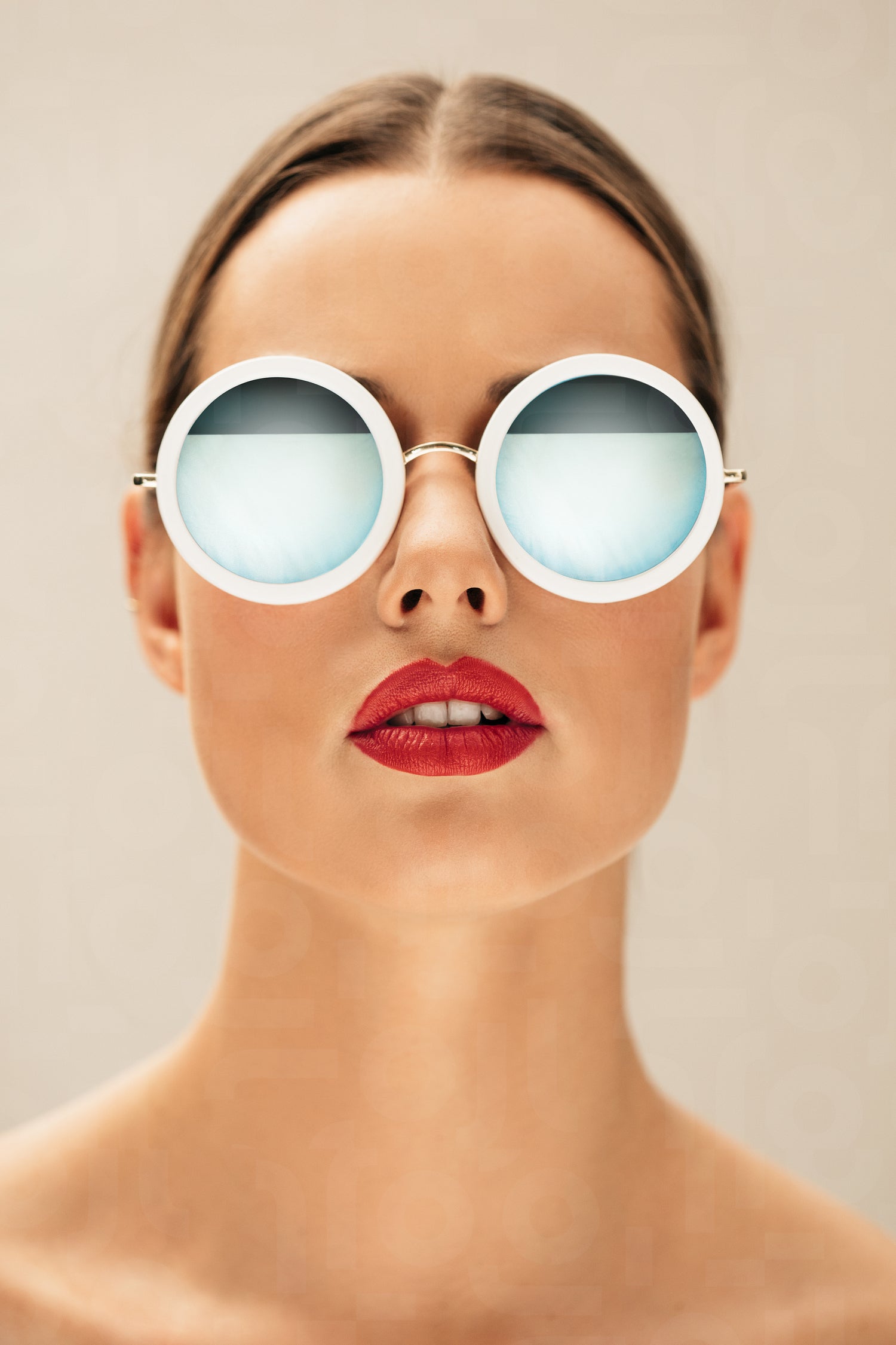 Close up vertical portrait of young woman wearing sunglasses. Caucasian female model posing against beige background.