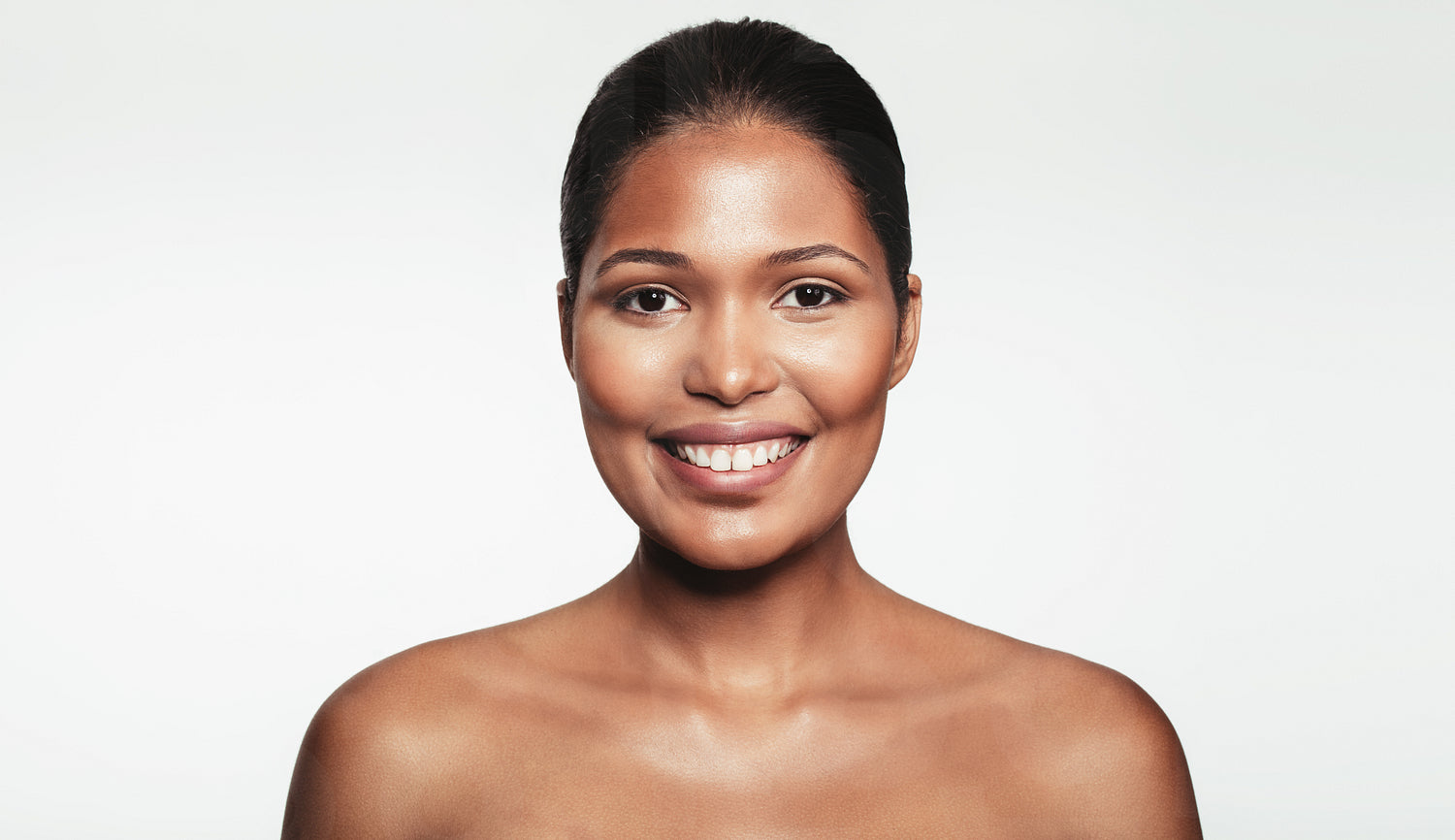 Portrait of happy young female with natural makeup against white background. Close up of beautiful young woman topless looking at camera.
