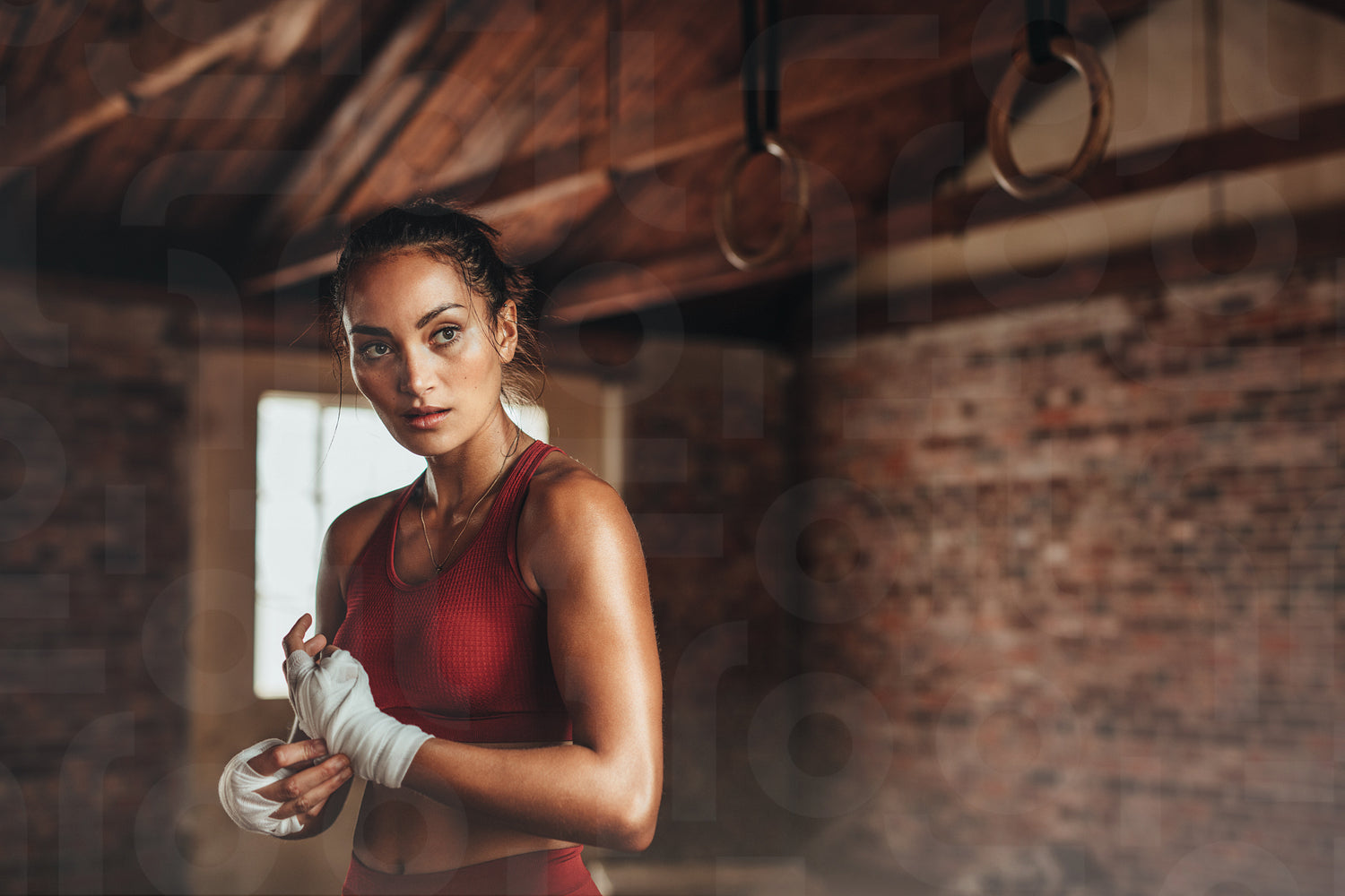 Confident young female boxer wearing strap on wrist. Boxing practice at gym. Woman in sports clothing preparing for boxing fight or workout.