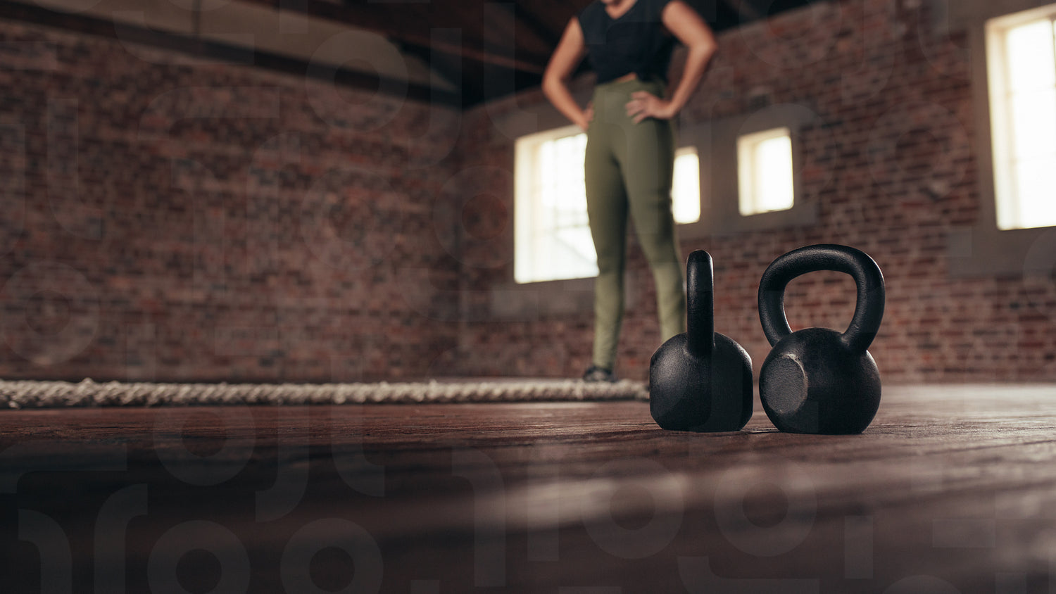 Kettle bells and battle rope on floor with woman standing at back with hands on hips. Female exercising at cross training gym.