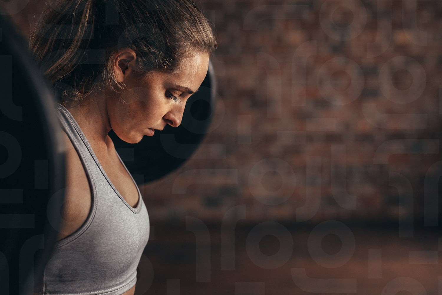 Determined woman at gym exercising with heavy weights. Fit young female working out with weights at cross training gym.