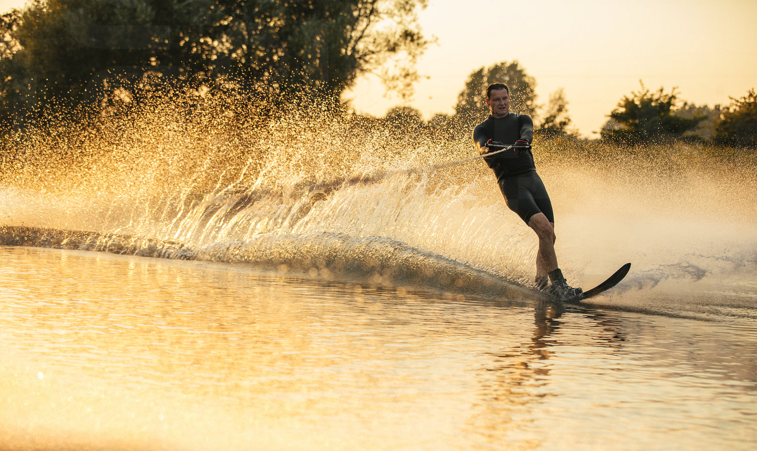 Man riding wakeboard in a lake. Water skier in action on the lake