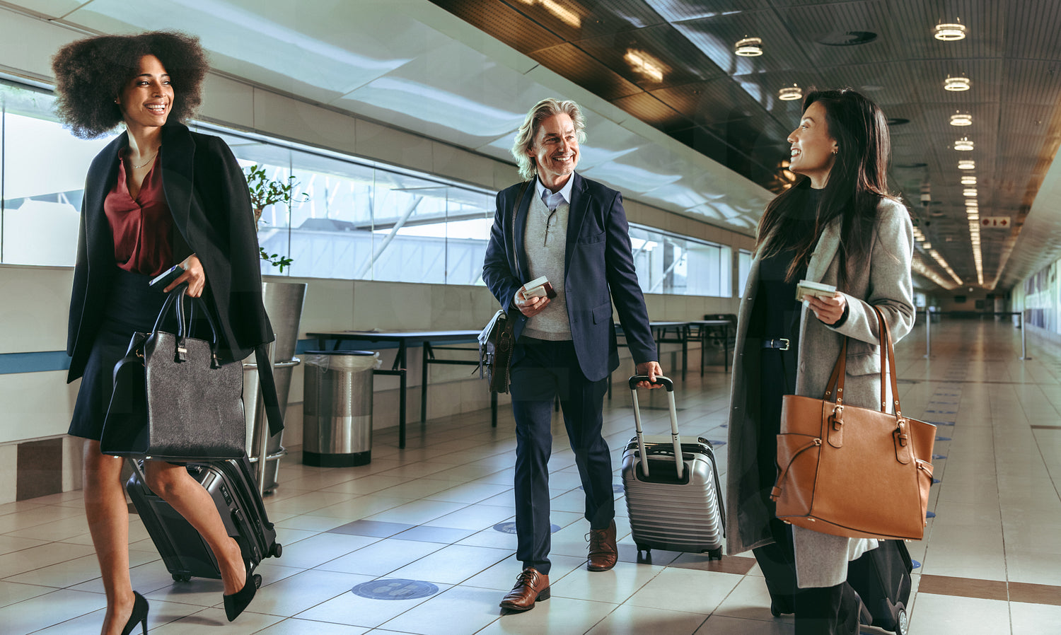 Small group of business people walking together in airport terminal. Business travelers with luggage going to board their flight.
