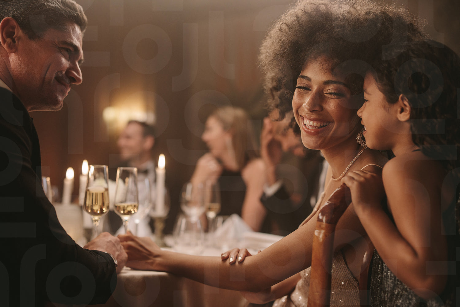 Cute girl talking with her mother and a man sitting at gala dinner party. Girl having fun with her mother sitting with friends at gala party.