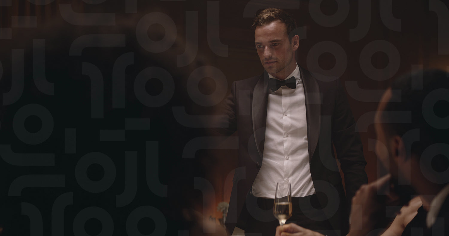 Handsome man making a toast with friends at party. Friends sitting at a table, toasting with wine and enjoying dinner together.
