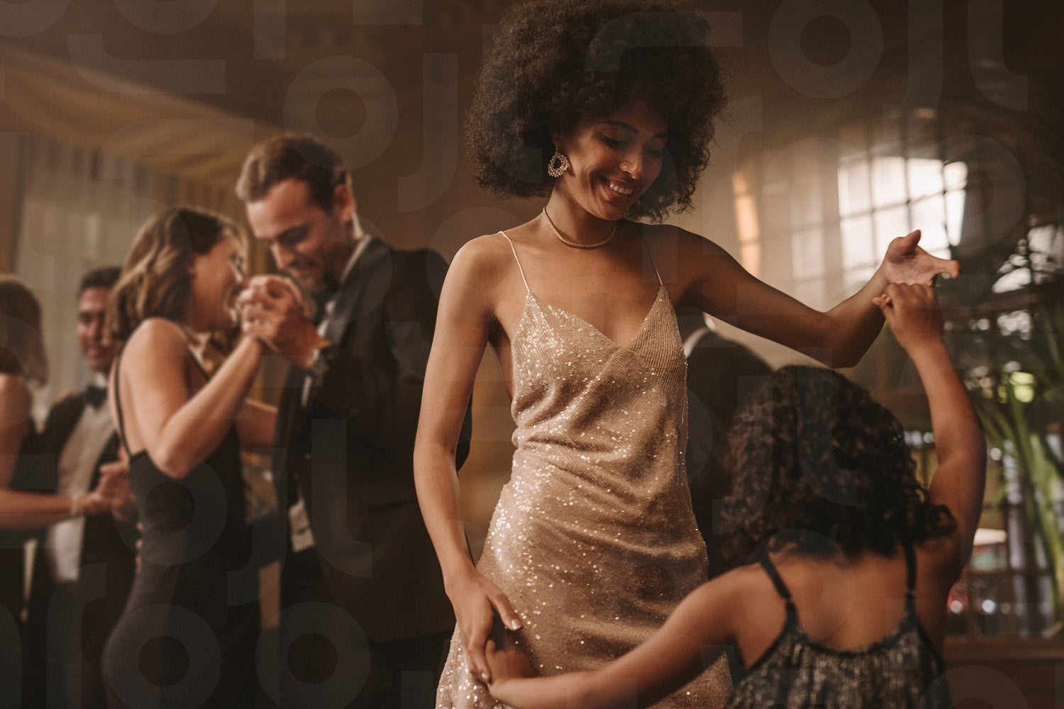 Mother and daughter having fun at gala night. Woman dancing with her girl at party.