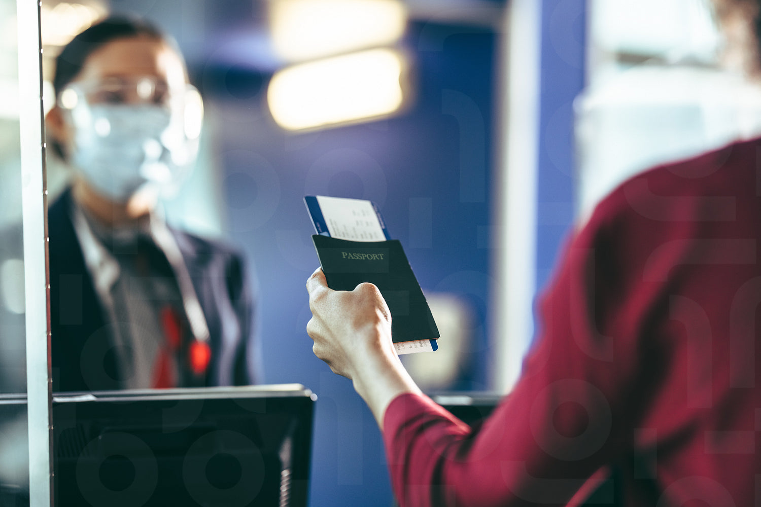 Cropped shot of a female passenger giving her passport with flight ticket to airline attendant behind check-in counter during covid-19 outbreak. Woman traveler doing check-in at the airport.