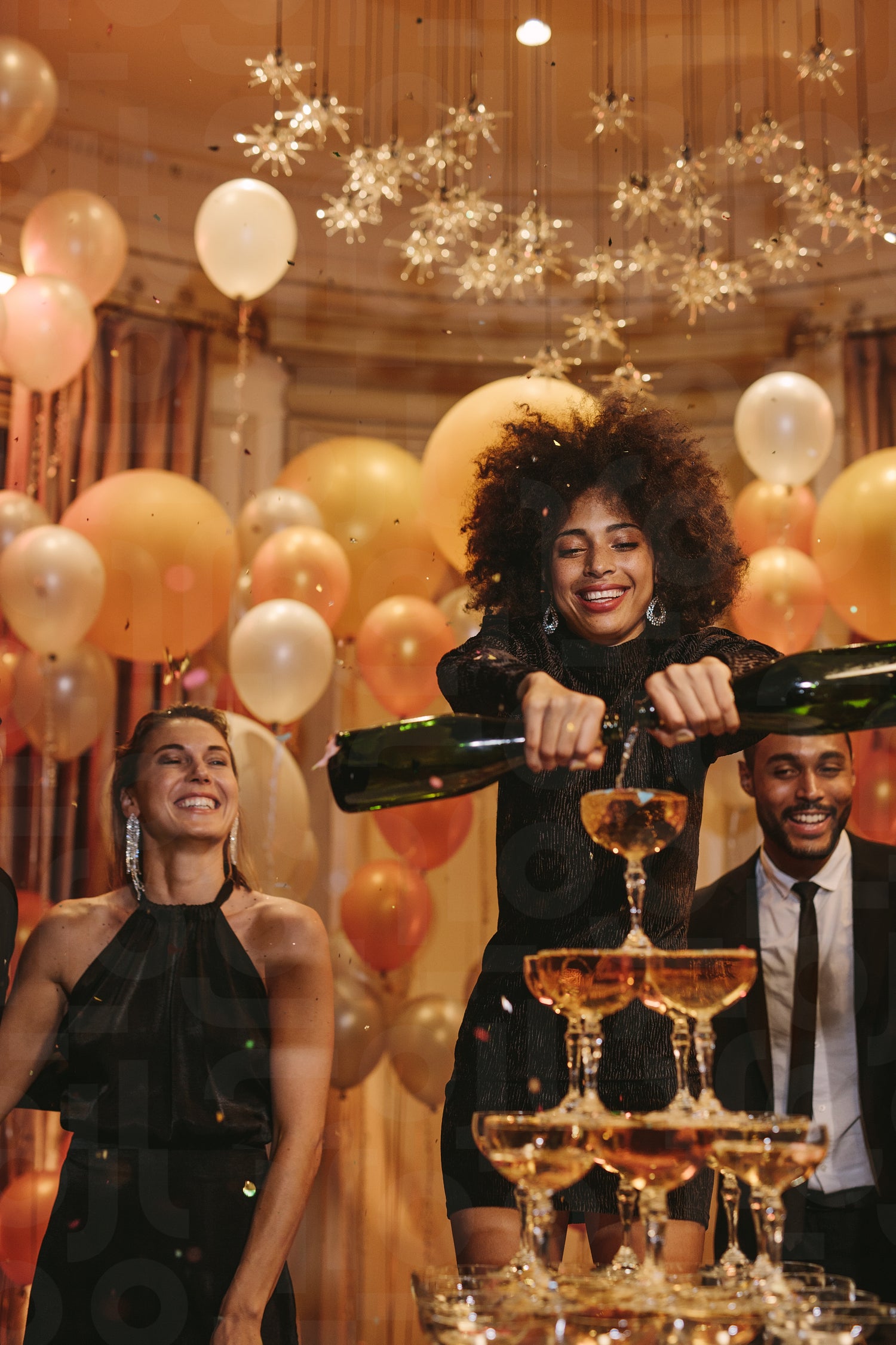 African young woman filling of champagne pyramid with friends in background at new years eve. Multi-ethnic socialites enjoying at a gala night party.