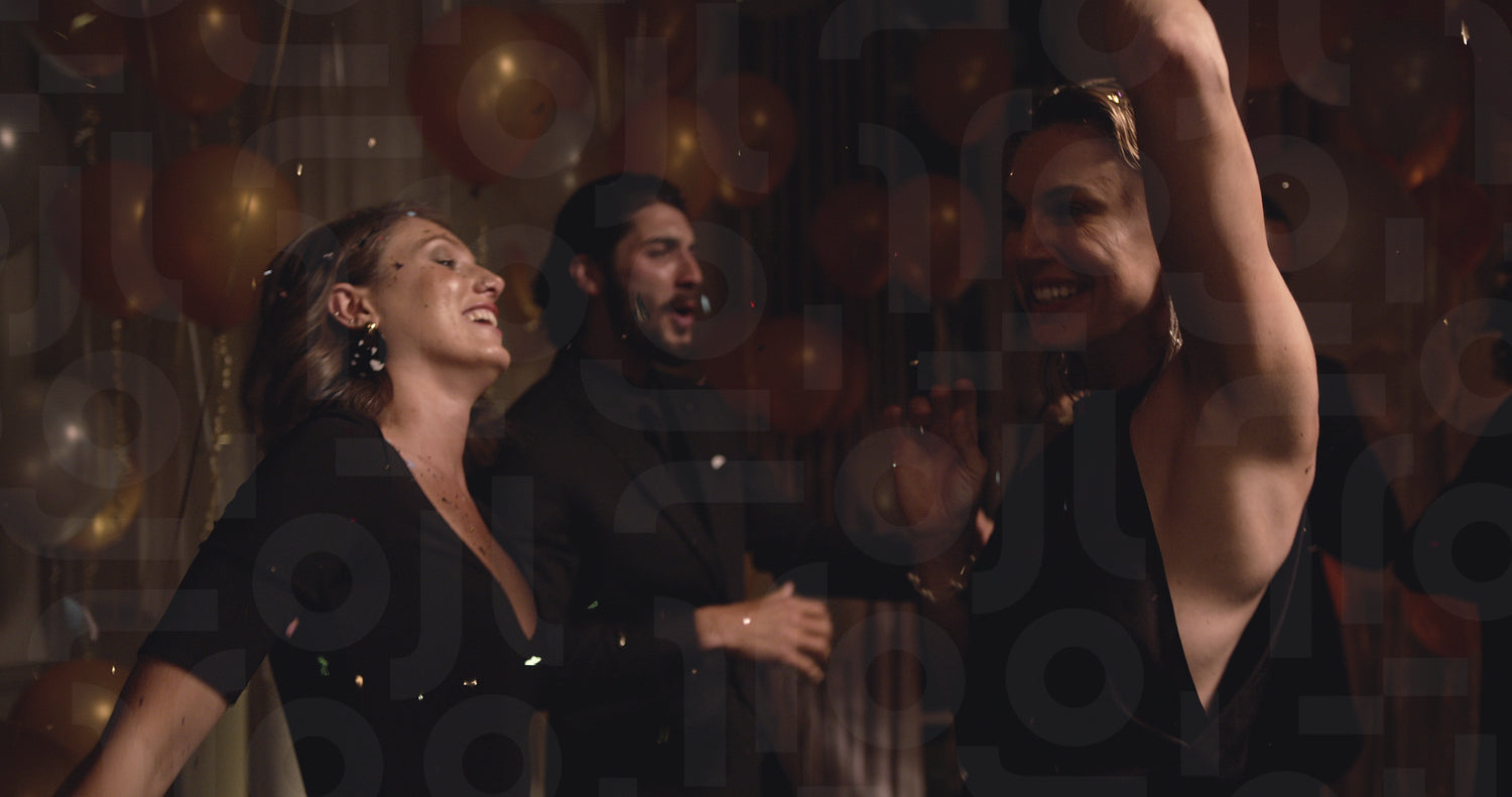 Beautiful young women dancing with friends around at gala night. Group of people enjoying themselves while dancing at a party.