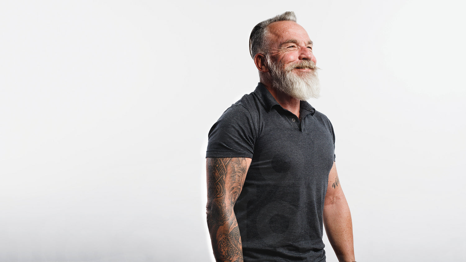 Happy senior man with tattoo on arms standing against white background. Portrait of old muscular male with a white beard looking away.