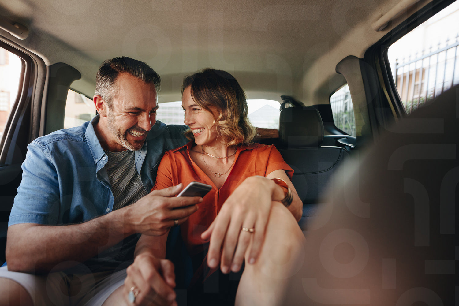 Beautiful couple in back seat of car. Loving couple with a phone traveling in a taxi.