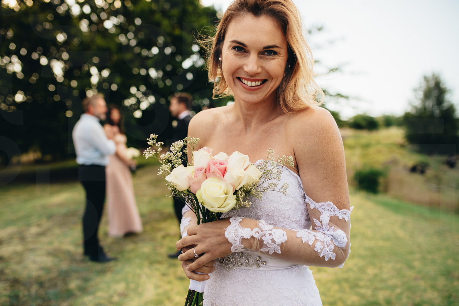 Portrait of beautiful bride holding flower bouquet looking at camera and smiling with guest in background. Bride looking happy at wedding party.
