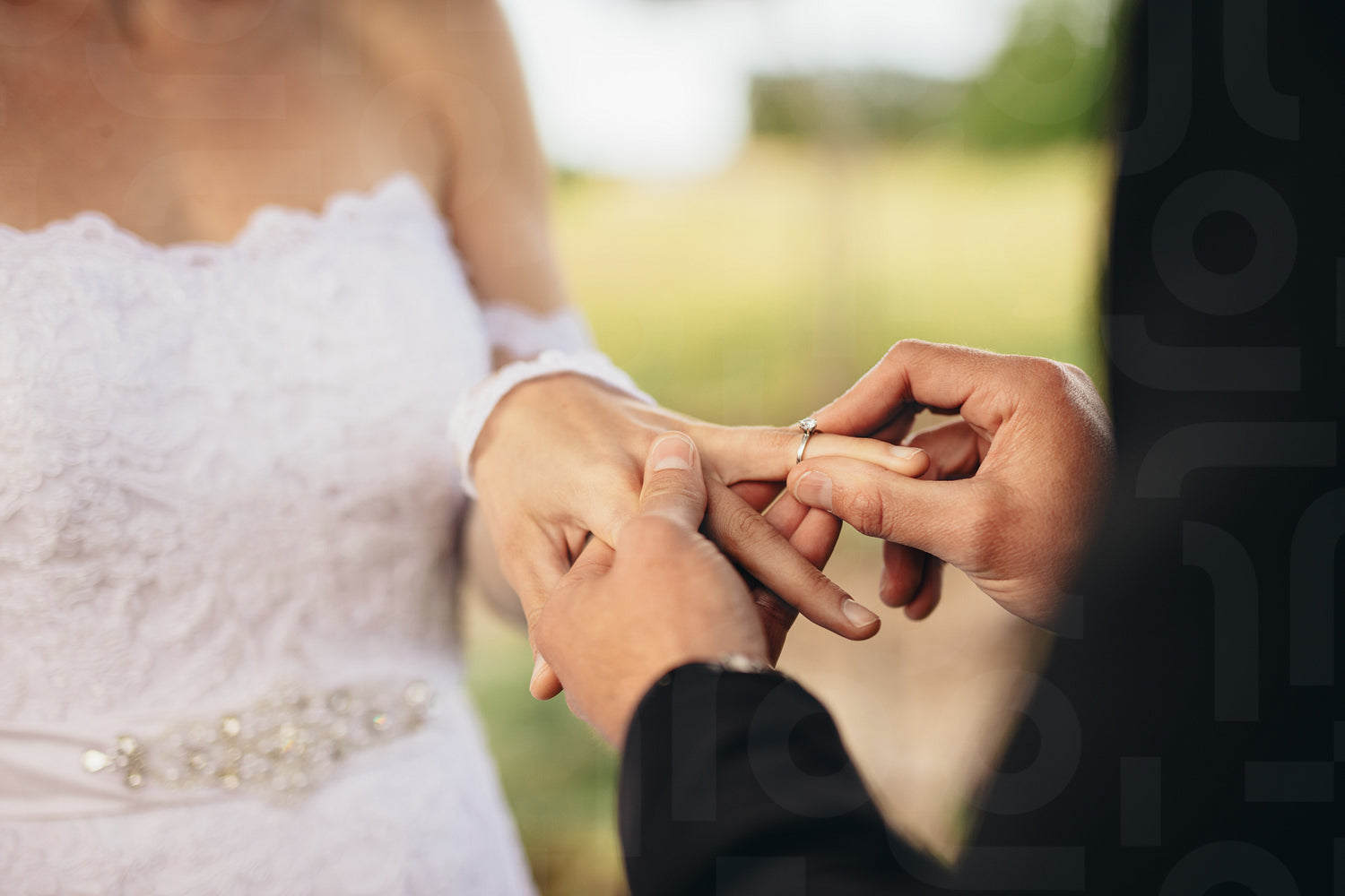 Closeup of couple exchanging wedding rings during their wedding ceremony outdoors. Cropped shot of groom putting a wedding ring on the finger of the bride.