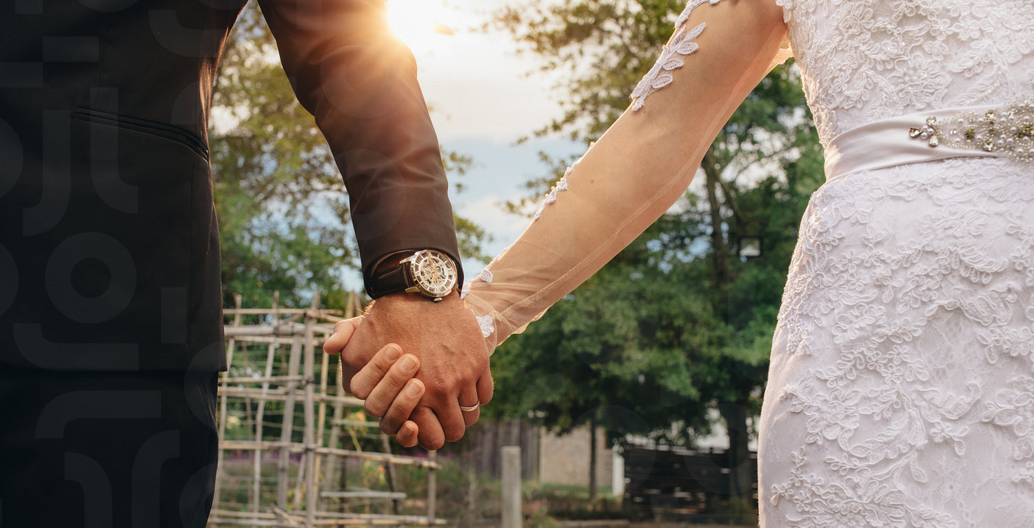 Close up of bride in white dress and groom in suit holding each others hands outdoors. Couple holding hands on their wedding day. Cropped shot with focus on hands.