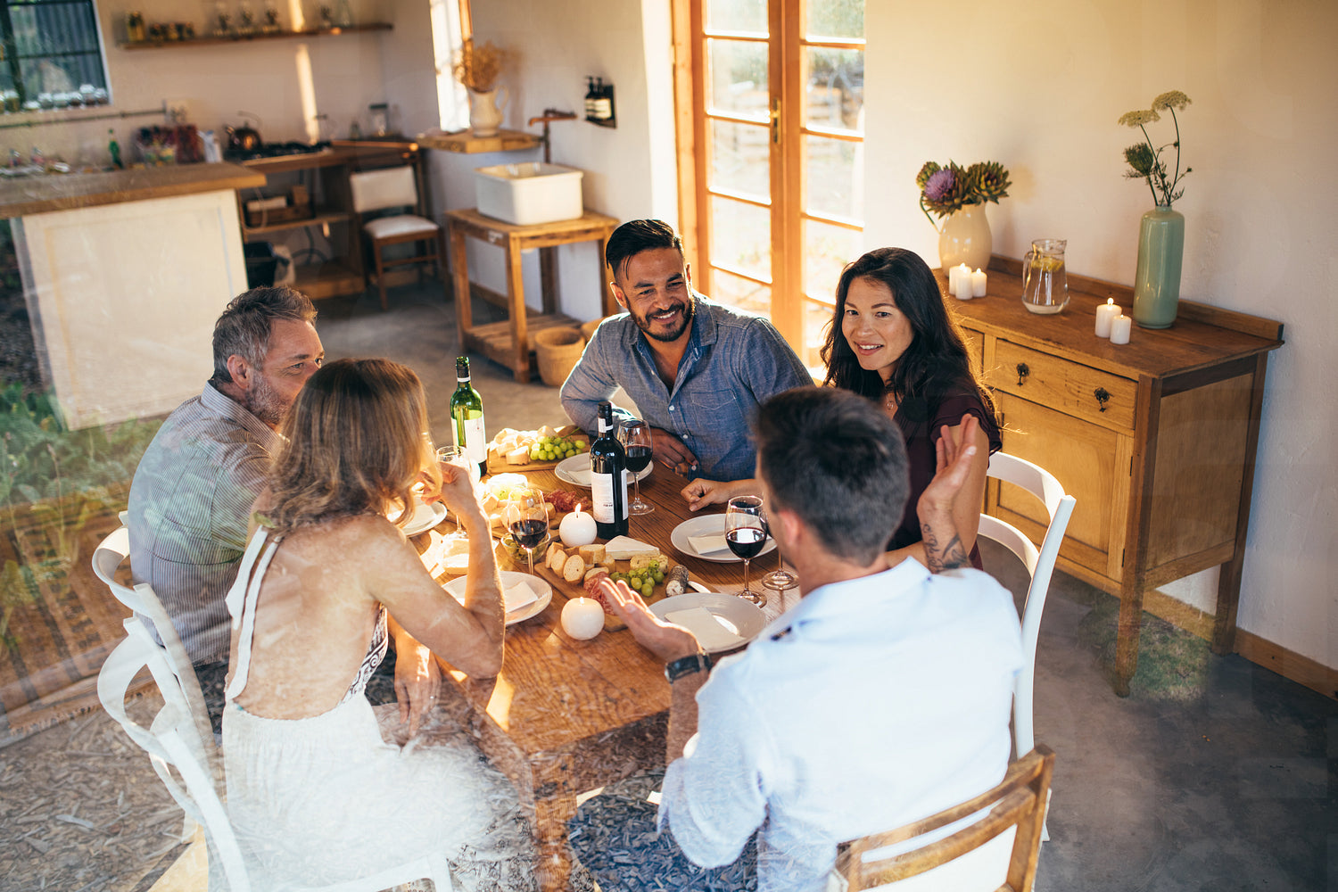 Friends sitting at a table talking during a dinner party. People gathering for eating food together and enjoying the party at home.