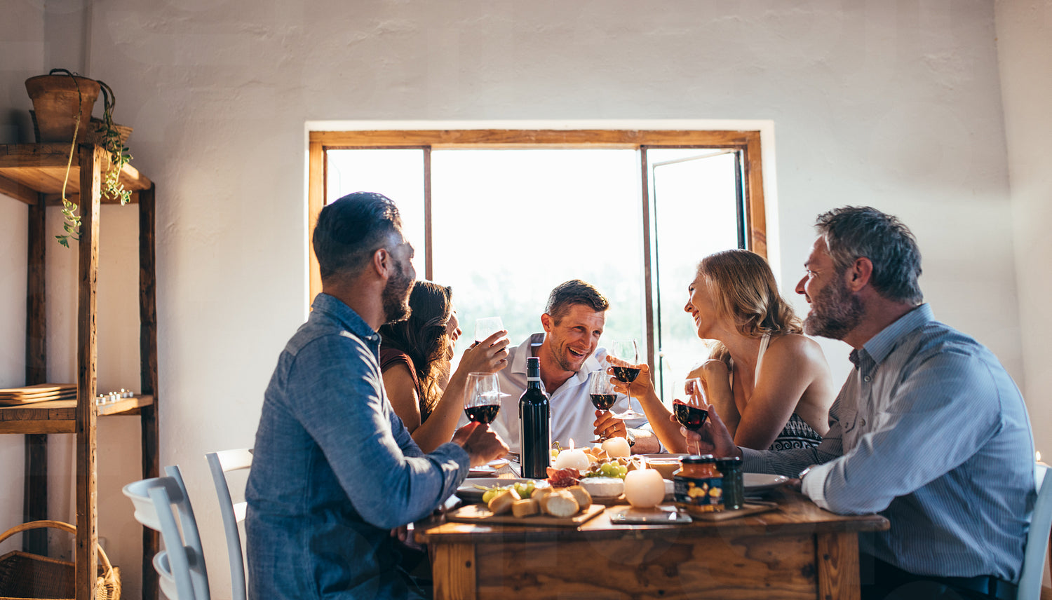 Young people got together by table with delicious food and glasses of red wine to celebrate a special occasion. Group of friends enjoying dinner party.