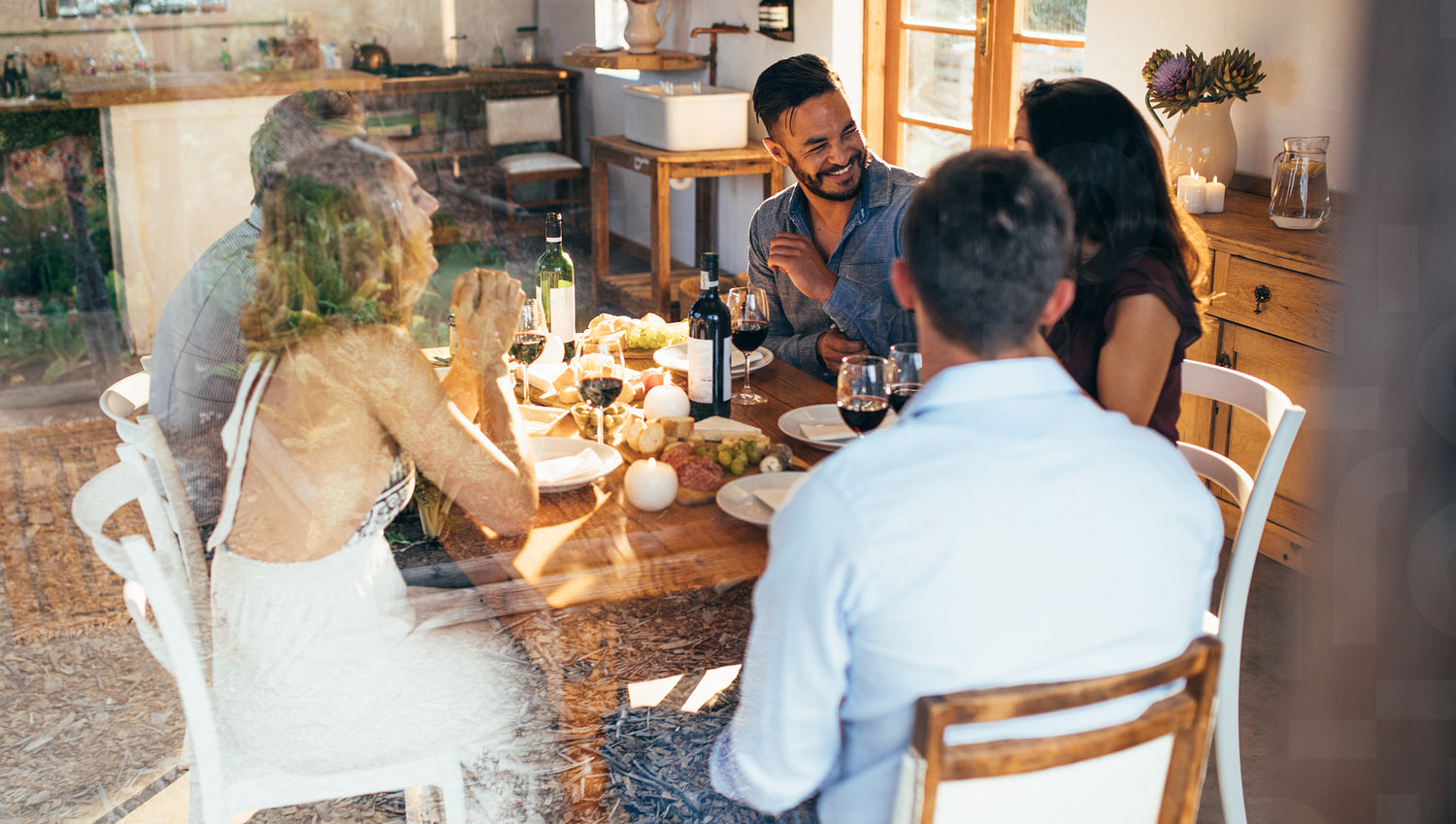 Young friends at a table talking over lunch at home. group of men and women enjoying meal at home together.